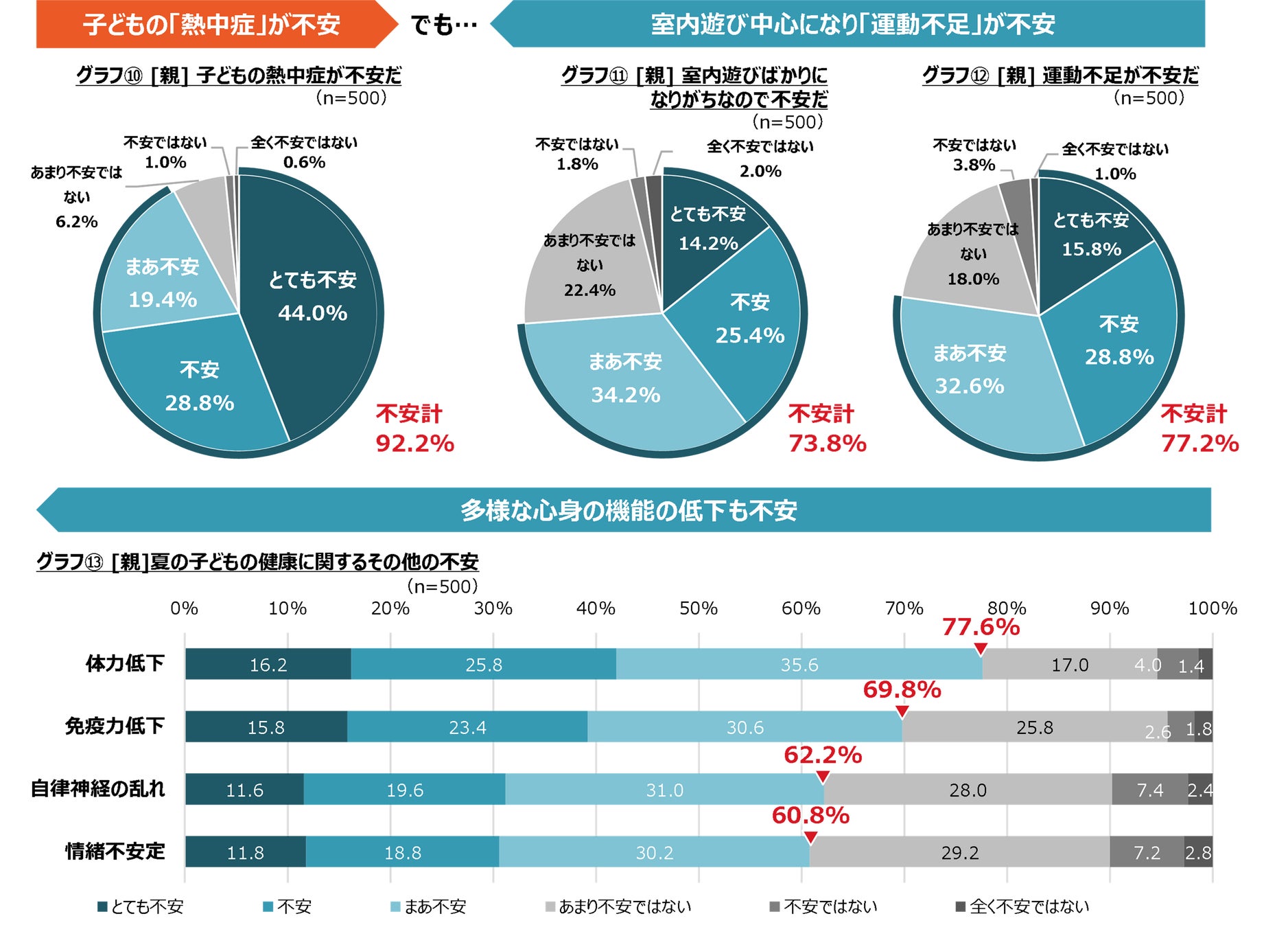 一方で、「室内遊びばかりになりがちなので不安」(73.8%)[グラフ⑪]、それによる「運動不足が不安」 (77.2%)でもあります。[グラフ⑫]熱中症も運動不足も怖い、「ダブル不安」を抱えていることが分かります。また、「体力低下」(77.6%)、「免疫力低下」(69.8%)、「自律神経の乱れ」(62.2%)、「情緒不安定」(60.8%)など、心身の機能低下への不安も強く、6割以上の親が挙げています。 [グラフ⑬]