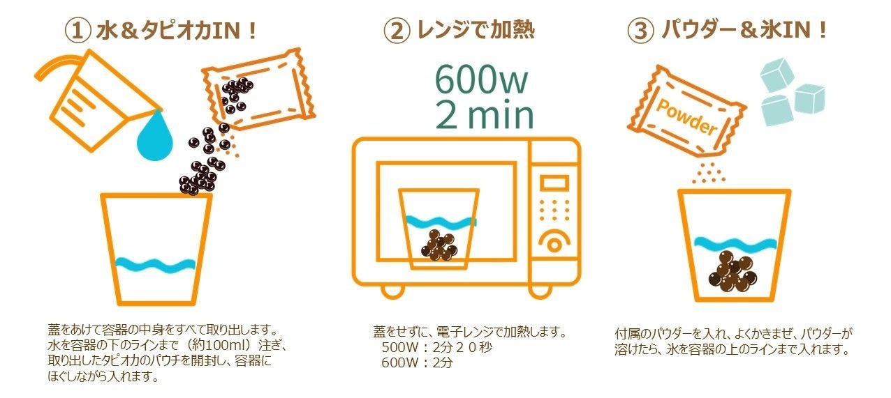 特別な技術も、道具も不要で、いつでも思い立った時に、ご自宅で簡単に3分でおいしいタピオカドリンクを作ることができます。コンロで火を使うこともないので、お子さまでも作ることができます*。(*6歳以下のお子様は召し上がらないでください。また、お子様が調理するときは、保護者が付き添い、やけどなど安全に配慮してください。)