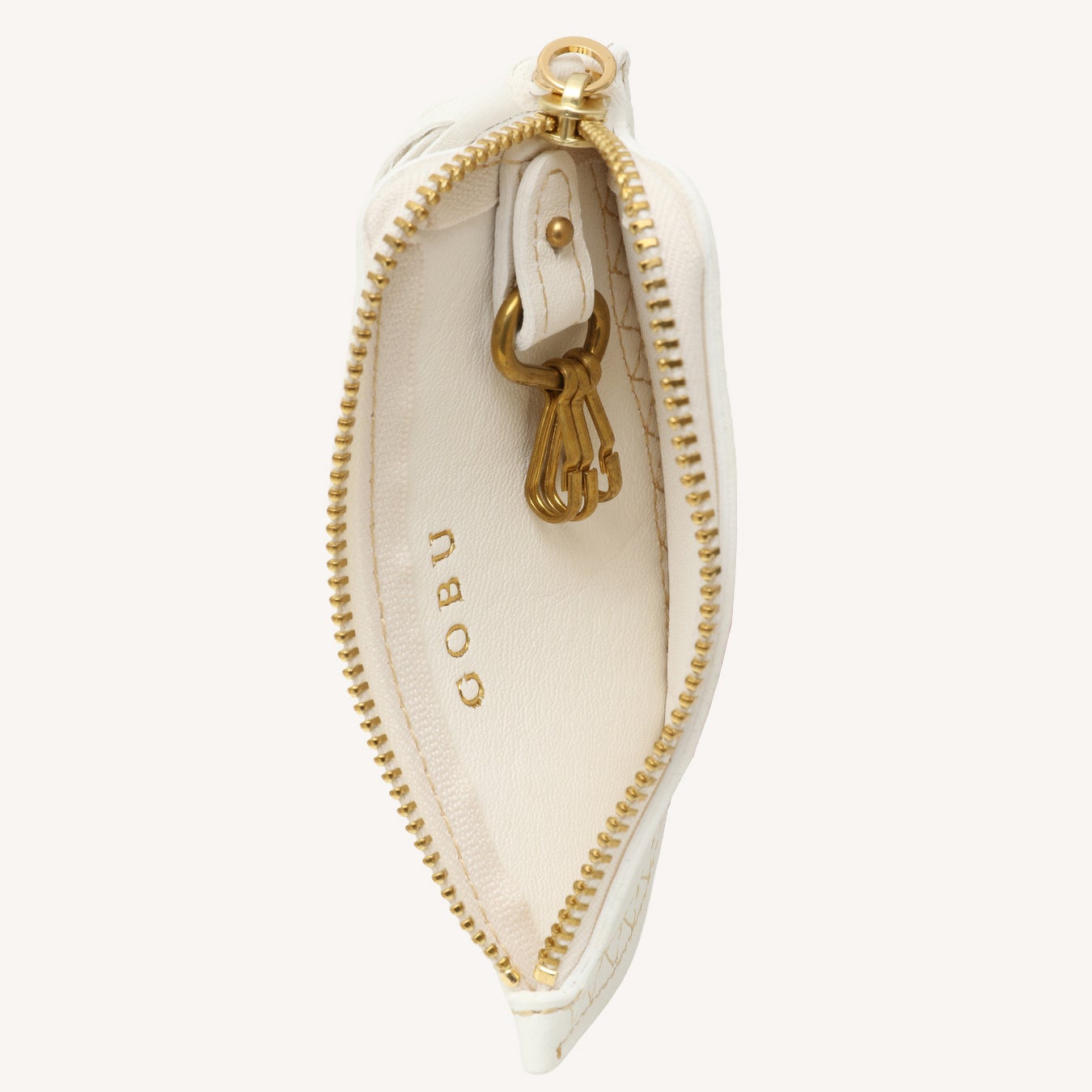 真鍮のリングが付属し、ホック式で簡単に着脱できます。鍵・スマートキー・小銭・紙幣(4つ折り)を使い方に応じて収納できる“手のひらサイズの多目的ケース”です。