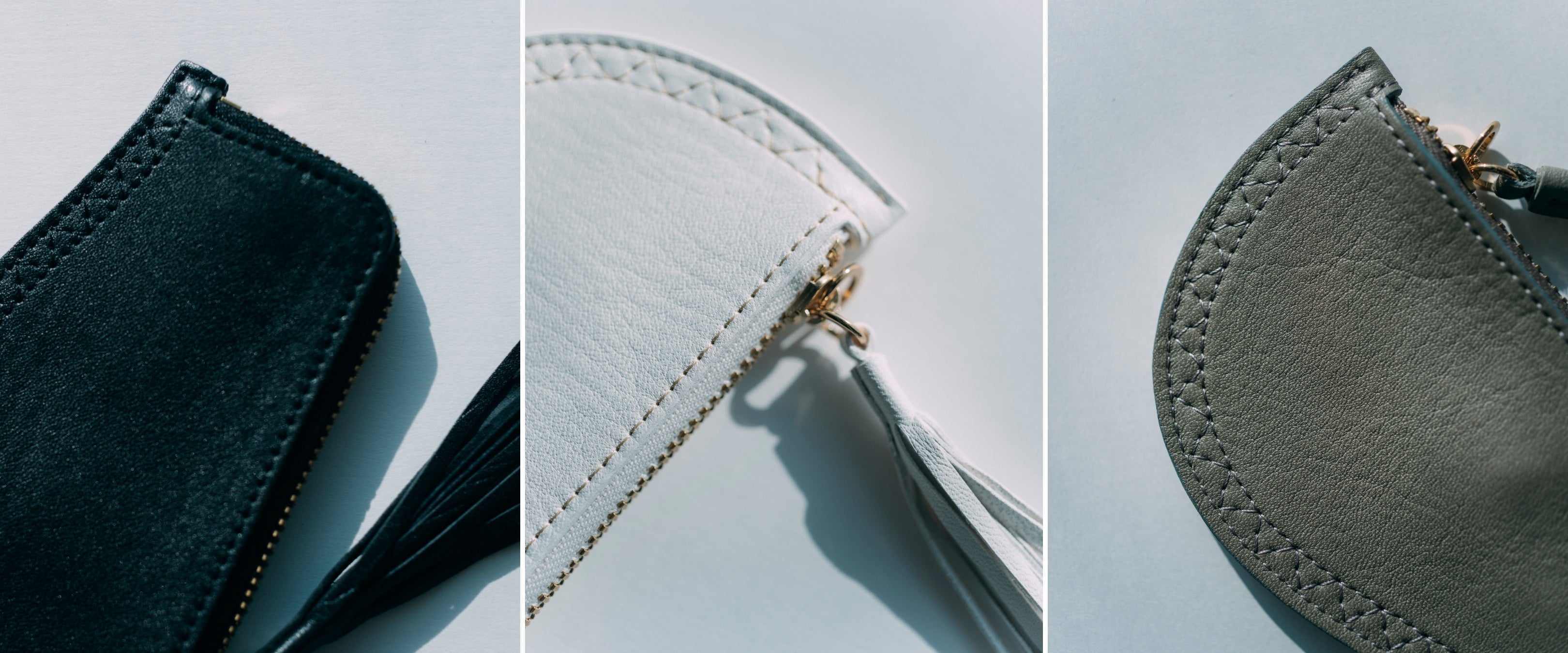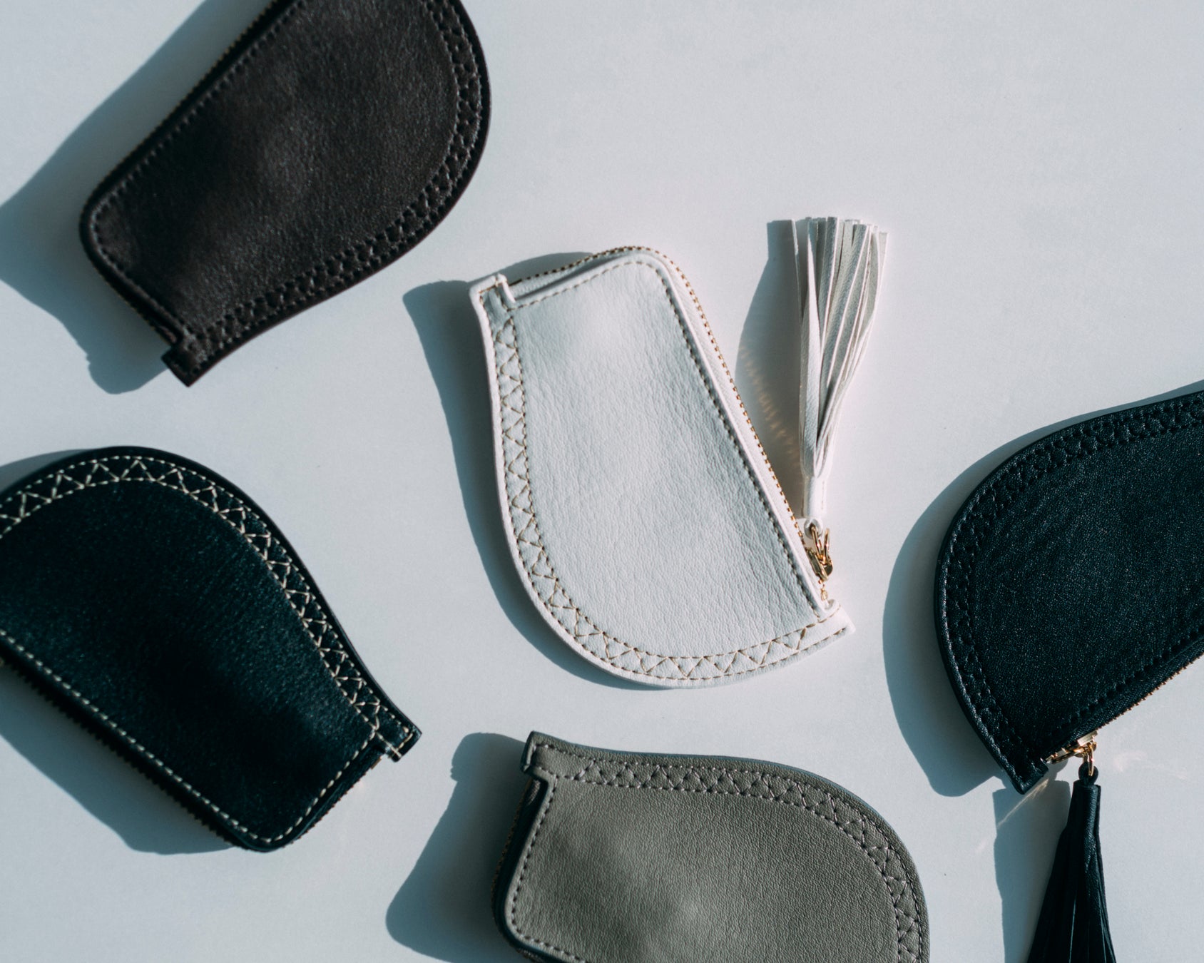 ホワイトは”無染色”の生まれたての素肌のようなレザー。他の4色は日常で使いやすいシックなカラーリングです。
