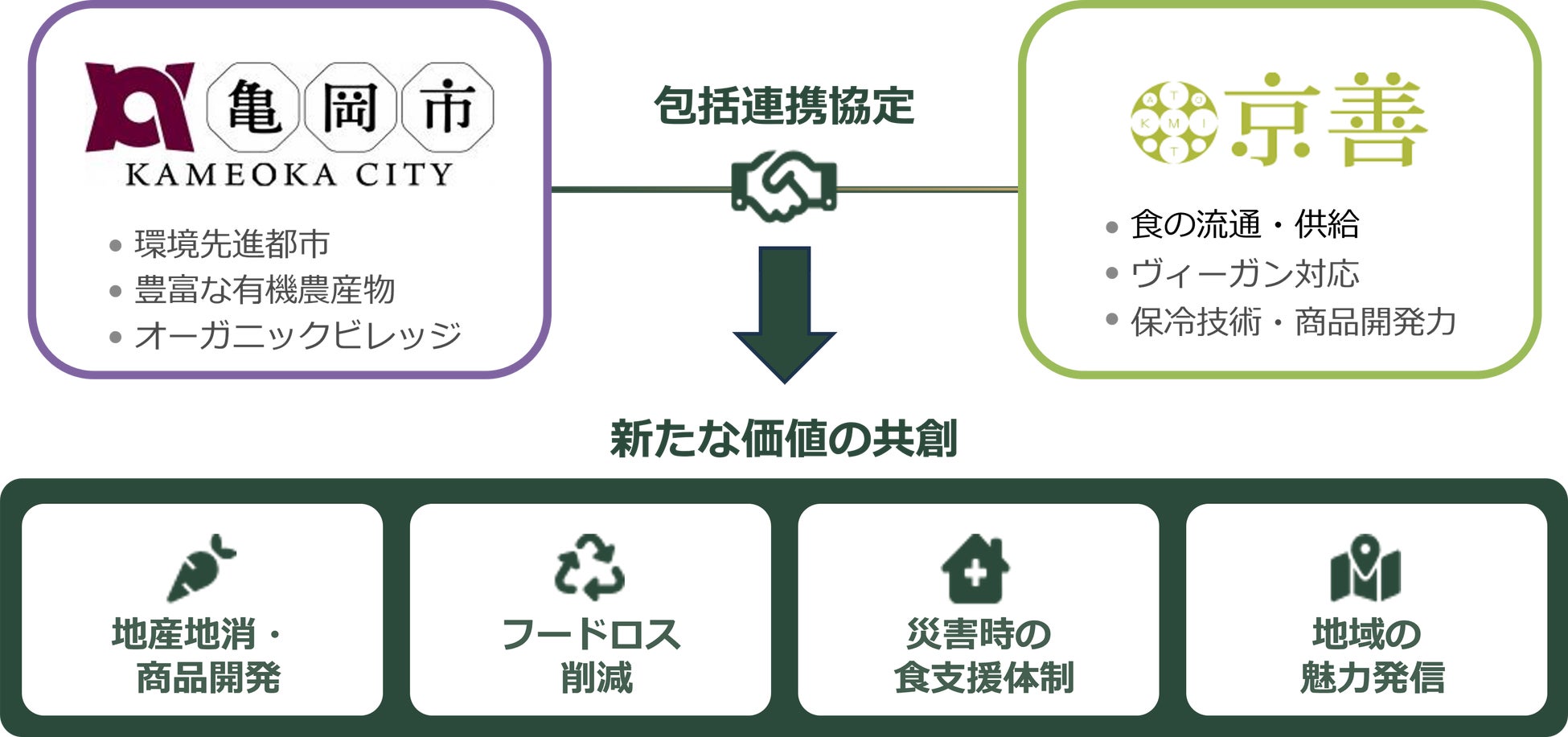 食と物流を通じた社会課題解決に取り組む株式会社京善(本社:京都府京都市、代表取締役:耳野 由基、以下「京善」)は、ヴィーガン対応を含む食の流通・供給モデルを強みとして、京都府亀岡市(市長:桂川孝裕、以下「亀岡市」)と、地域の課題解決および持続可能なまちづくりに寄与することを目的とした「包括連携協定」を2026年1月30日(金)に締結いたします。