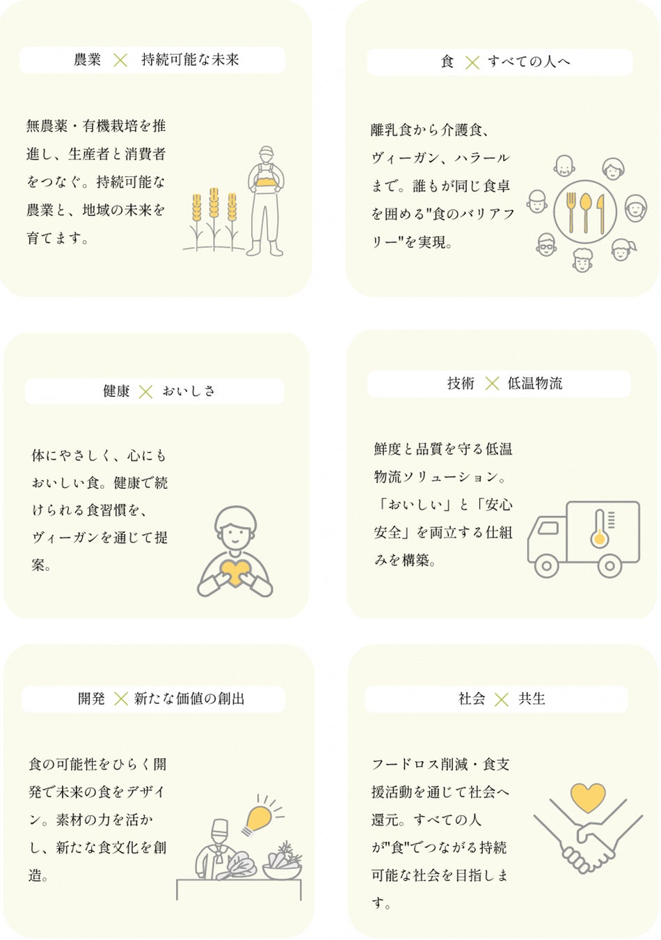 「農業」「食」「健康」「社会貢献」を主たるテーマに掲げ、京都から新しい文化を創造する企業です。地域農家の支援や保冷物流技術の活用などを通じ、食やサービスを通じて人々に喜びと癒しを届けることを目指しています。