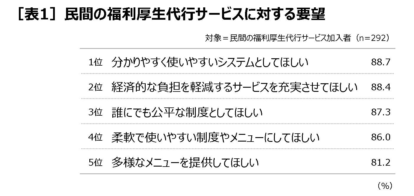 加入者の民間の福利厚生代行サービスに対する要望は、「分かりやすく使いやすいシステムとしてほしい」(88.7%)、「経済的な負担を軽減するサービスを充実させてほしい」(88.4%)、「誰にでも公平な制度としてほしい」(87.3%)が上位に挙げられました[表1]。