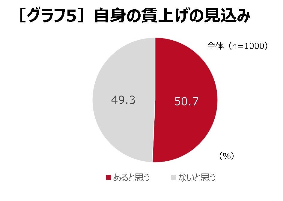 各種報道によると、一部企業において、物価上昇や人手不足を反映し、給与を上げる動きが出てきていますが、今後の自身の賃上げの見込みについて聞くと、賃上げが「あると思う」50.7%、「ないと思う」49.3%と、ほぼ半々の結果でした[グラフ5]。賃上げは期待できないという人が半数を占めました。