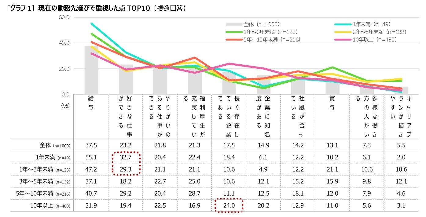 正社員として働く20代〜60代の男女1,000人を対象に、現在の勤務先を選ぶ際に何を重視したかを聞きました。すると、「給与」(37.5%)、「好きな仕事ができる」(23.2%)、「やりがいのある仕事ができる」(21.8%)に次いで、「福利厚生が充実している」(21.3%)の順となりました。勤続年数別に見ると「給与」が重視されることは変わりませんが、勤続3年未満の勤続年数が短い人は「好きな仕事ができる」を次いで重視しているのに対し、勤続10年以上の人は「長く存在している企業である」を重視しています[グラフ1]。