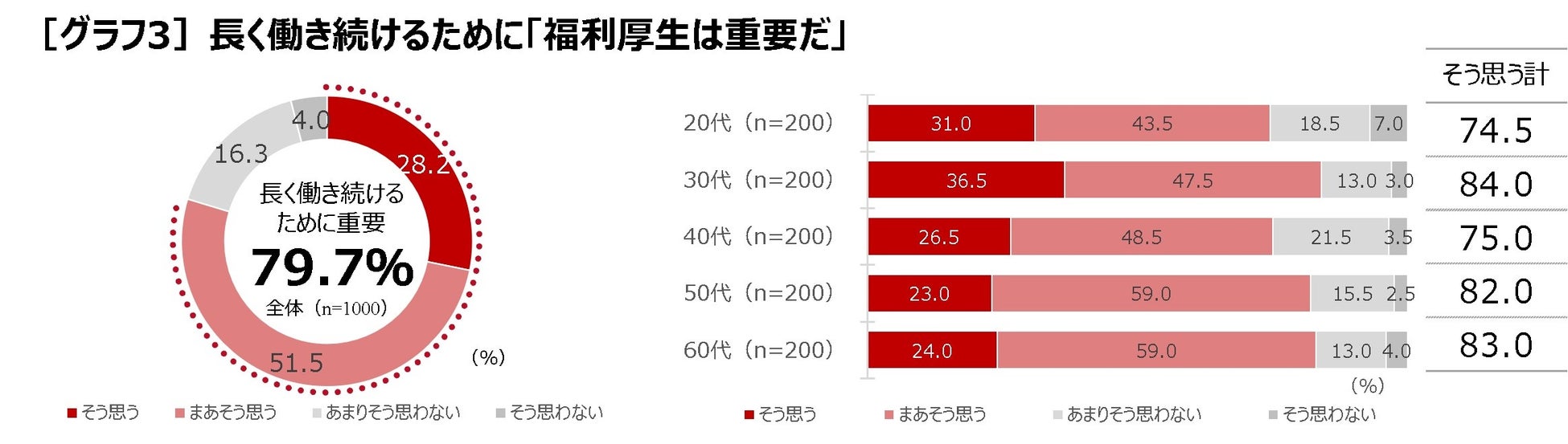 ●長く働き続けるためには「福利厚生が重要」と約8割(79.7%)が実感。