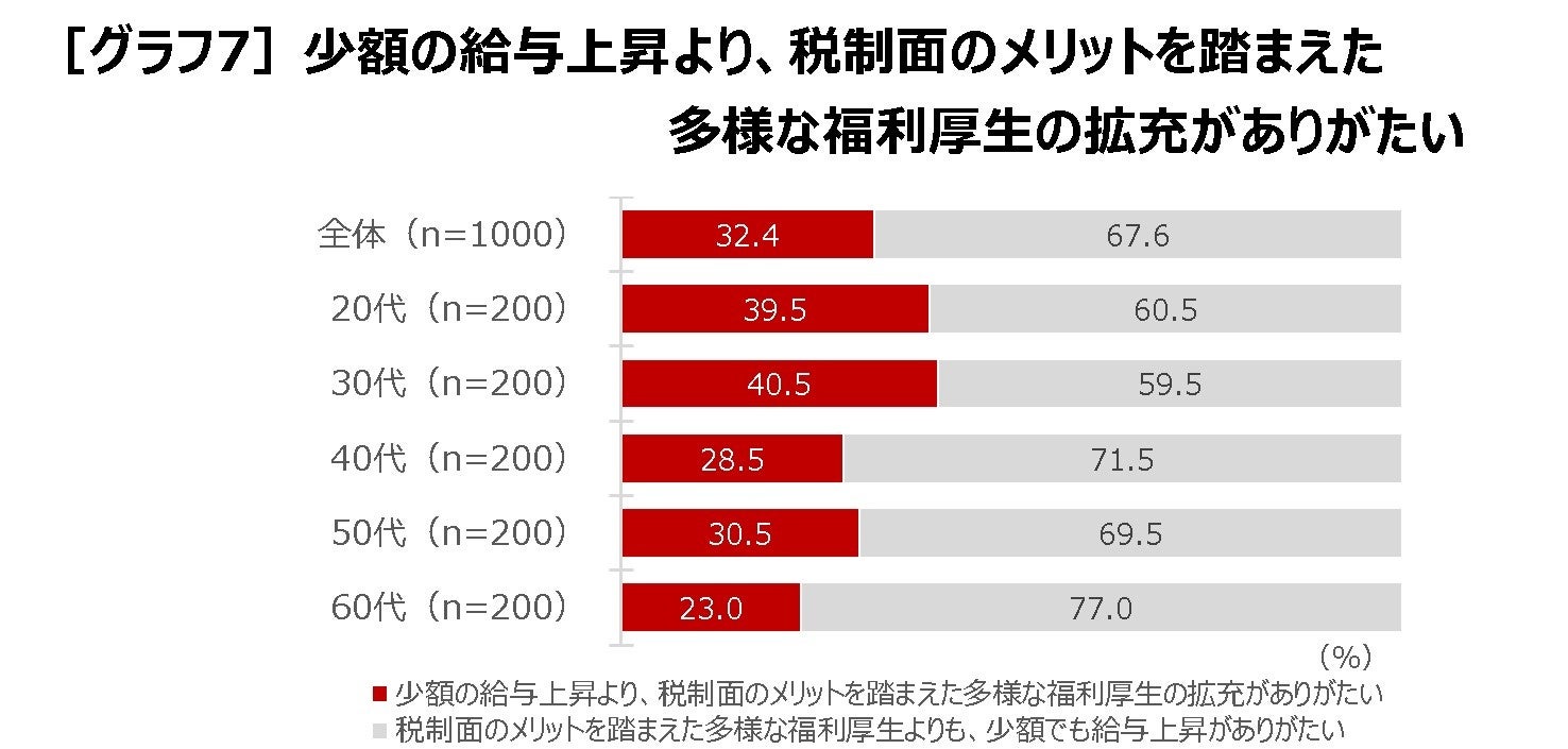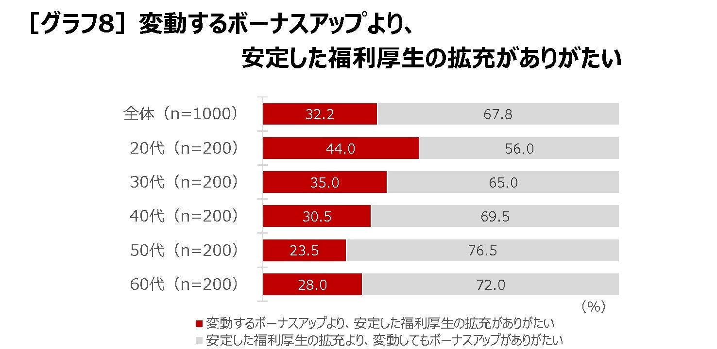 賃金アップと福利厚生の充実を比較すると、賃金アップを望む人が多いものの、「少額の給与上昇より、税制面のメリットを踏まえた多様な福利厚生の拡充がありがたい」(32.4%)[グラフ7]、「変動するボーナスアップより、安定した福利厚生の拡充がありがたい」(32.2%)[グラフ8]といった声も少なくなく、およそ3人に1人は福利厚生の充実を選んでいます。