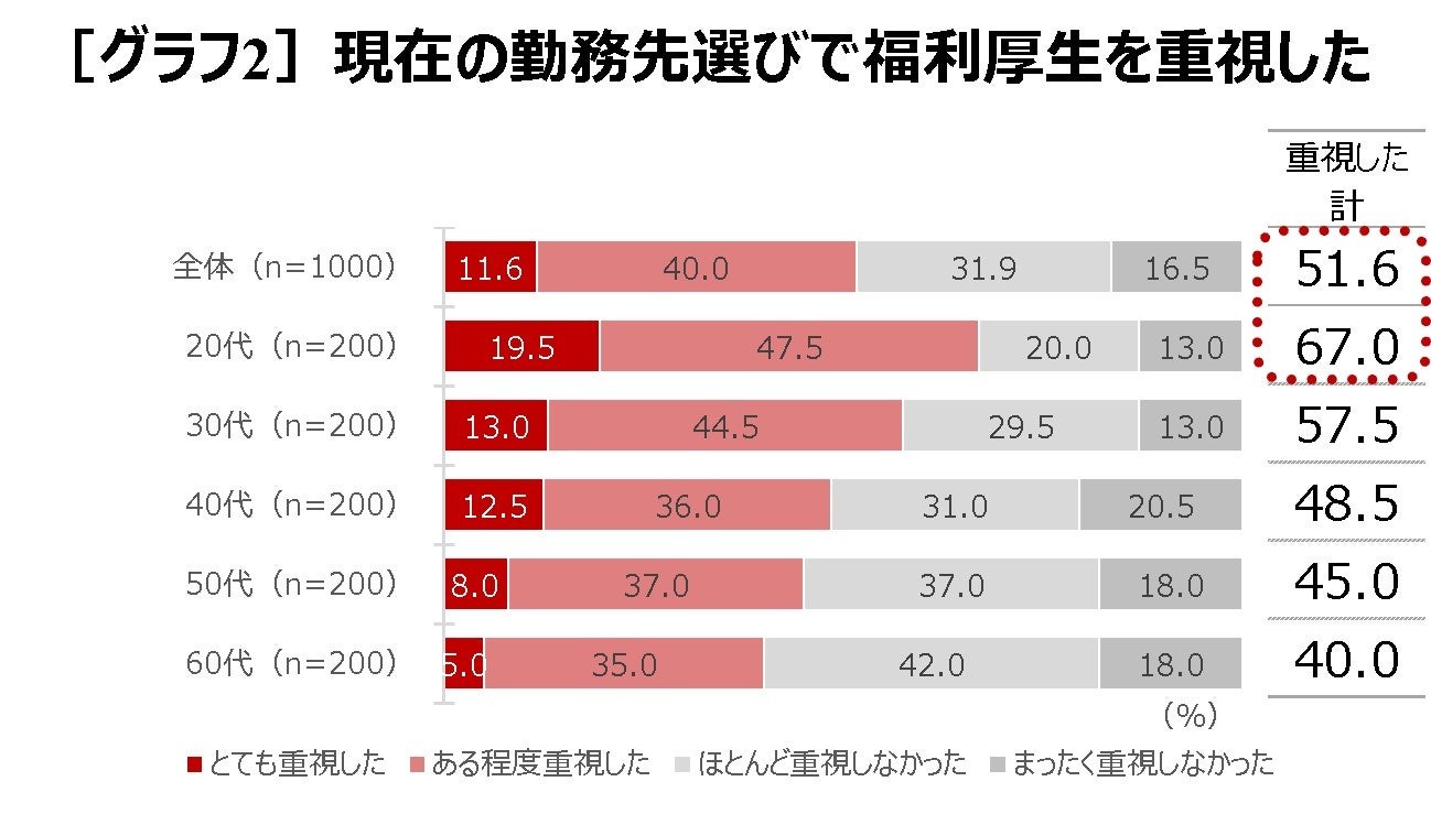 現在の勤務先選びで福利厚生を重視したかと聞くと、51.6%(とても重視した11.6%+ある程度重視した40.0%)と半数を超える人が「重視した」と回答しており、これは若い世代ほど高くなっています[グラフ2]。若手ビジネスパーソンには特に、生活の実利サポートになる福利厚生が「企業選び」のカギになっていることが明らかとなっています。