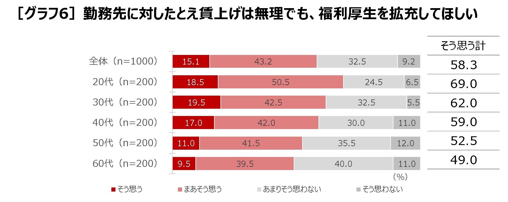 このような経済事情の中、勤務先に対したとえ賃上げは無理でも、福利厚生を拡充してほしいかと聞くと、58.3%と約6割が福利厚生の拡充を望んでいます。年代別に見ると20代が69.0%、30代が62.0%と、若い世代の望む声がより高くなっています[グラフ6]。