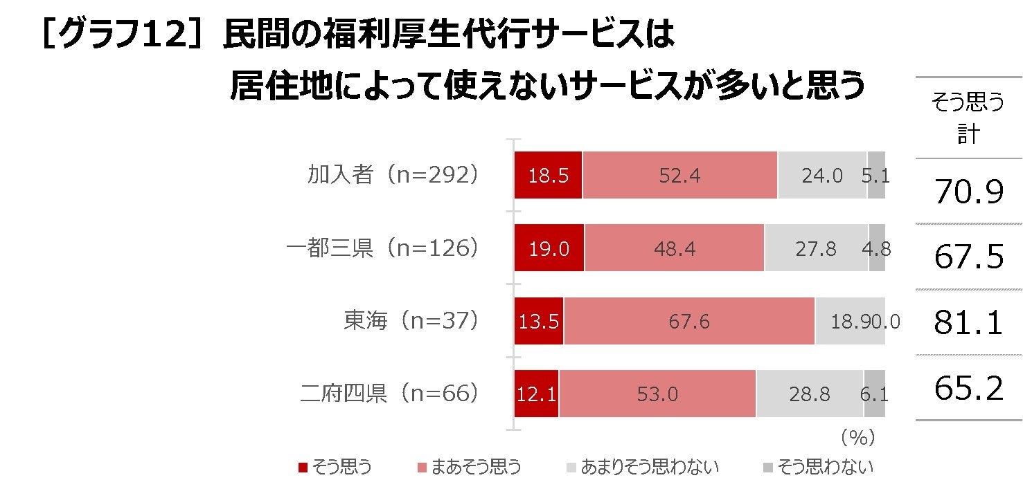 グラフ11の通り「近くで利用できるサービスがない」も民間の福利厚生代行サービスを利用しない理由として挙げられますが、加入者に民間の福利厚生代行サービスは居住地によって使えないサービスが多いと思うかと聞くと、70.9%が同意しています。