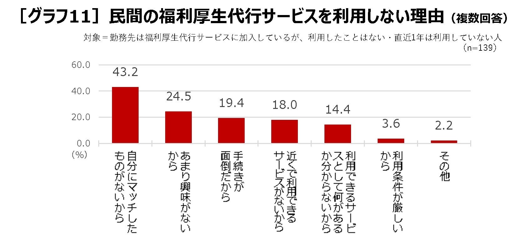 加入者に利用状況を聞くと、44.5%が「1年以内に1回以上利用」、22.3%が「利用したことはあるが、直近1年は利用していない」となり、加入者の66.8%が利用しています[グラフ10]。加入しているものの利用したことはない、または直近1年は利用していないと答えた人に、利用しない理由を聞くと、「自分にマッチしたものがないから」(43.2%)が多く、「あまり興味がないから」(24.5%)、「手続きが面倒だから」(19.4%)「近くで利用できるサービスがないから」(18.0%)なども挙げられました[グラフ11]。