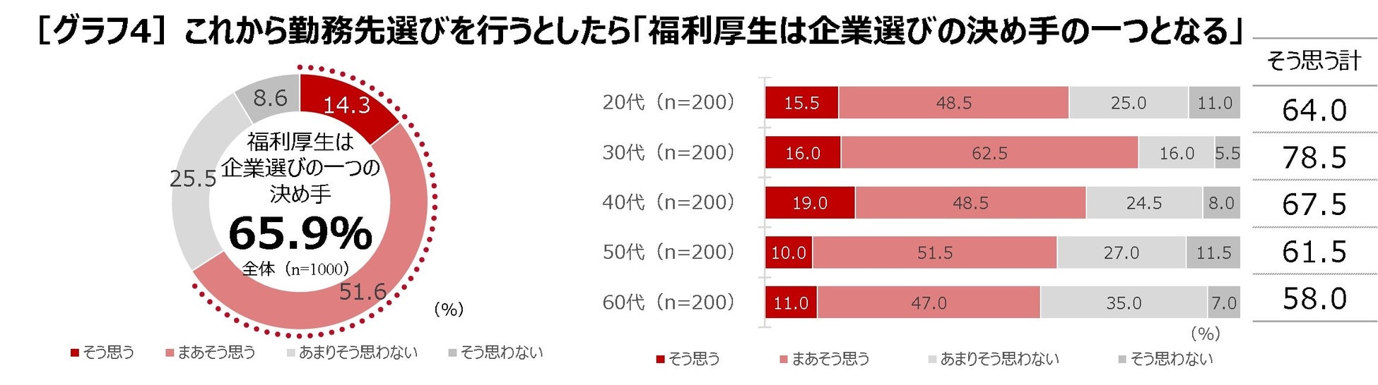 また、これから勤務先選びを行うとしたら、福利厚生は企業選びの基準(決め手)の一つになると思うかと聞くと、およそ3人に2人に当たる65.9%が「そう思う」(そう思う14.3%+まあそう思う51.6%)と答えており、働き盛りの30代では78.5%とさらに高くなっています[グラフ4]。