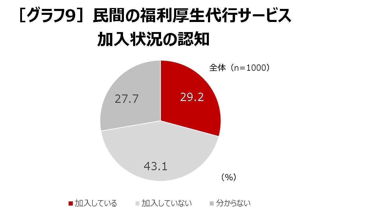 勤務先が民間企業が提供する福利厚生代行サービスに加入しているかと聞くと、約3割が「加入している」(29.2%)と答えていますが、ほぼ同数の27.7%は加入しているかどうか「分からない」と答えています[グラフ9]。