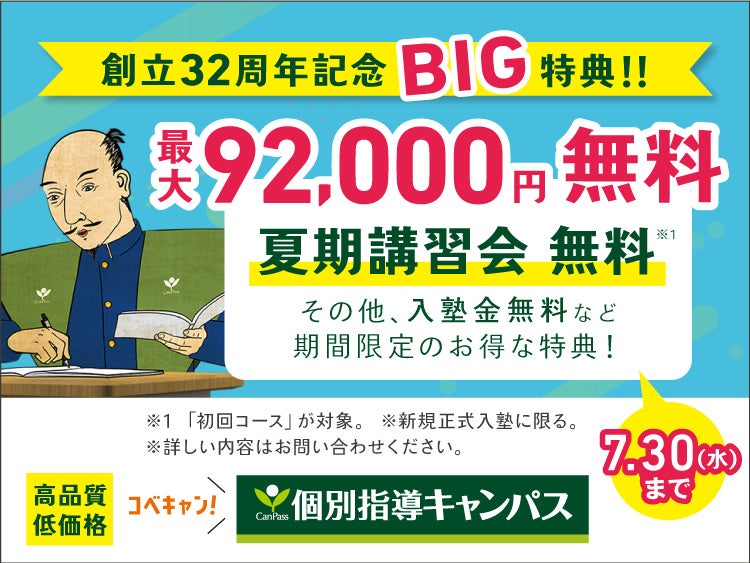 「コベキャン」「キャンパス」の愛称でおなじみの個別指導キャンパスは、低価格で高品質な個別指導塾です。他の個別指導塾の6割程度の授業料を創業当初から維持しています。大阪・兵庫・京都・滋賀・奈良・愛知・愛媛・東京・千葉・埼玉・福岡に直営校舎を展開中。成績が上がらなければ3ヶ月間授業料免除となる成績保証制度を業界でもいち早く導入し、「絶対に成績を上げる」をモットーに、地域に密着した教室展開をしています。当塾の8割が友人同士の紹介や口コミからのご入塾で、高い評価をいただいております。