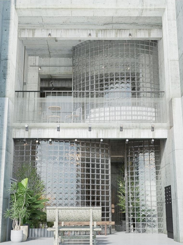 セットバックした入口を大胆に天井を抜き、ガラスブロックを目一杯堆積。
