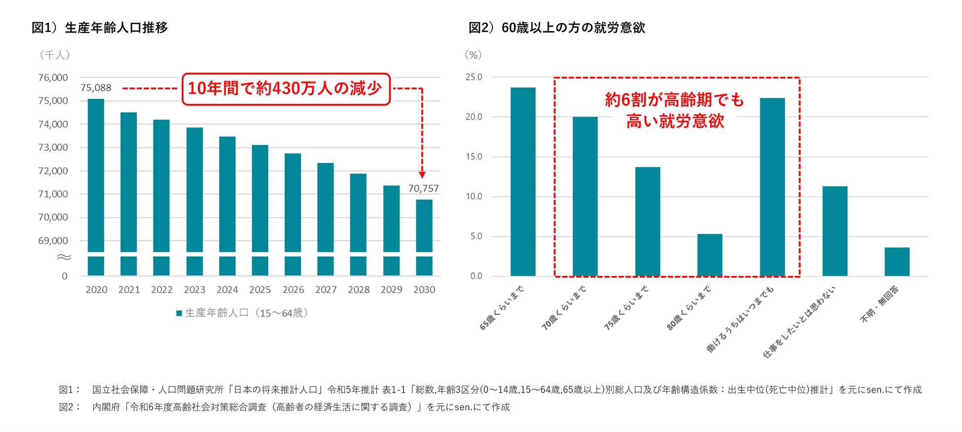 日本では、2020年から2030年のわずか10年で約430万人の生産年齢人口(15〜64歳)が減少するという深刻な課題に直面しています(※1)。その一方で、60歳以上の約8割が高齢期にも高い就業意欲を持っています(※2)。しかしながら、その豊富な経験や知識が十分に活かされているとは言えない状況です。
