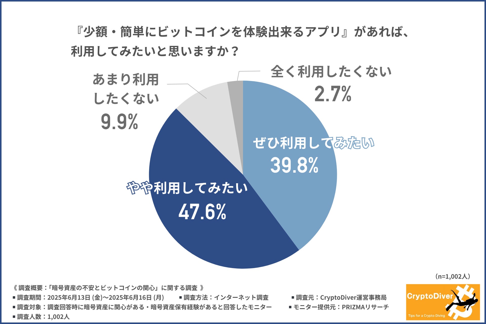 最後に、「少額・簡単にビットコインを体験できるアプリ」の利用意向を尋ねたところ、『ぜひ利用したい(39.8%)』『やや利用してみたい(47.6%)』と、約9割の方が前向きな意向を示しました。