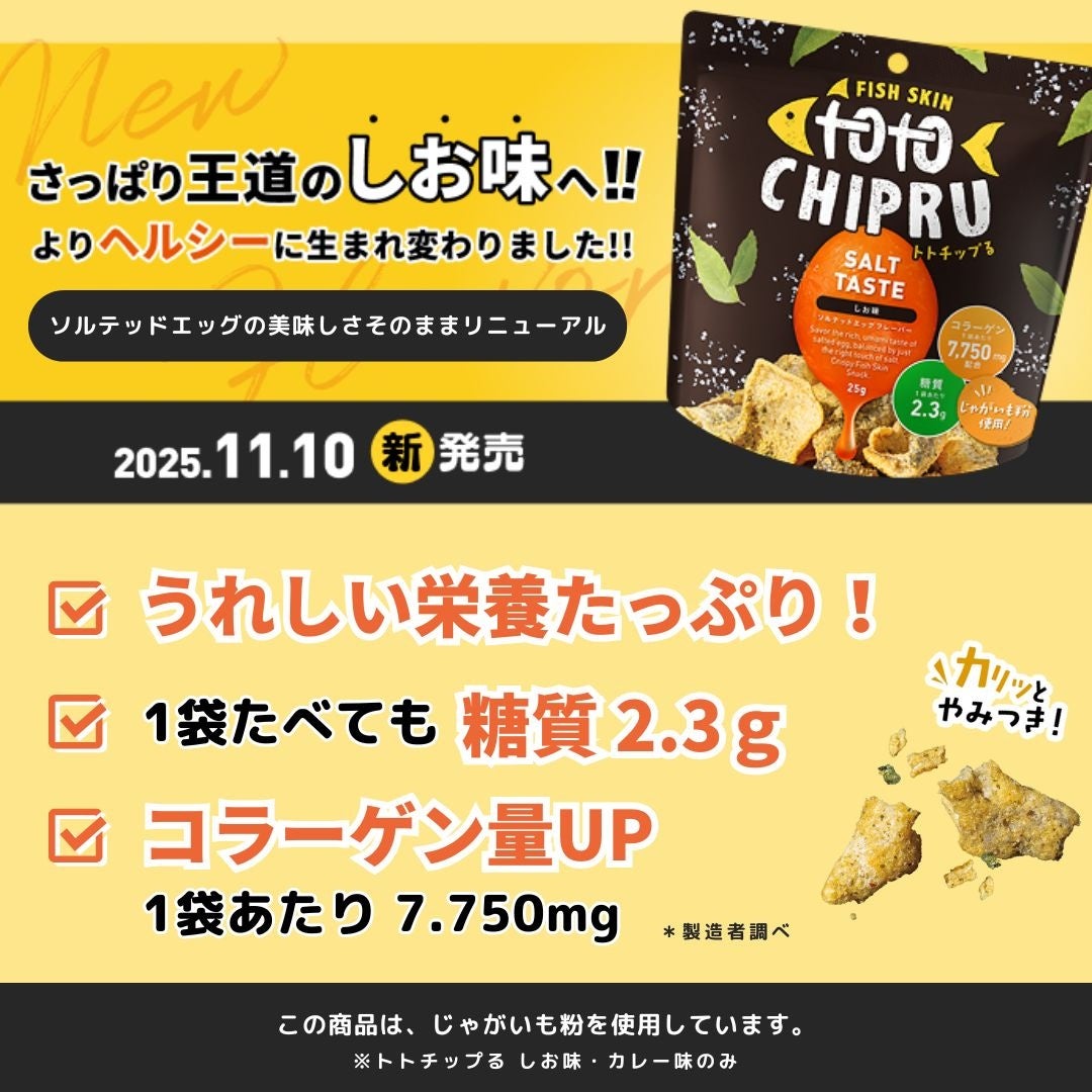 魚の皮をそのままスナックに。ヘルシー&エシカルフードブランド「SUKOO(スクー)」を展開する株式会社エスグロー(本社:兵庫県神戸市、代表取締役:瀬川雅矢)は、海の資源を活かしたスナック「トトチップる」シリーズより、「トトチップる しお味」を2025年11月10日(月)にリニューアル発売いたします。