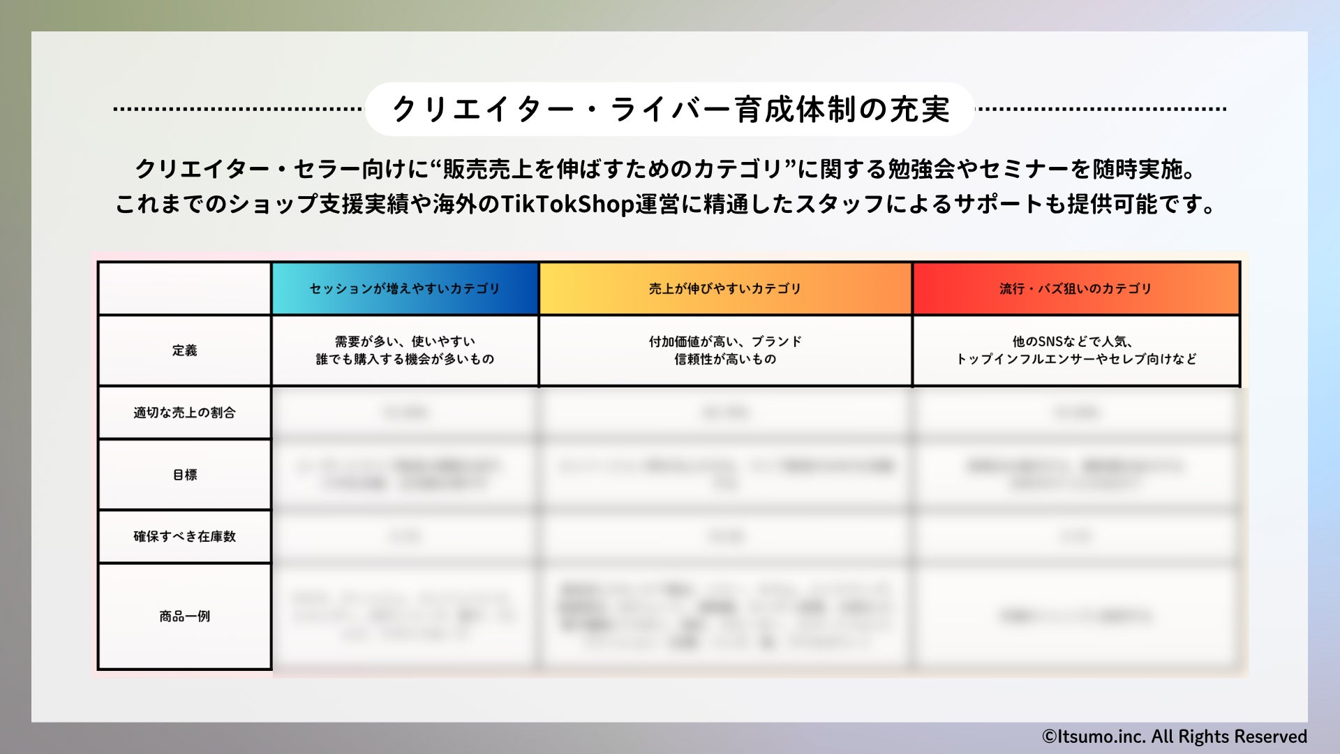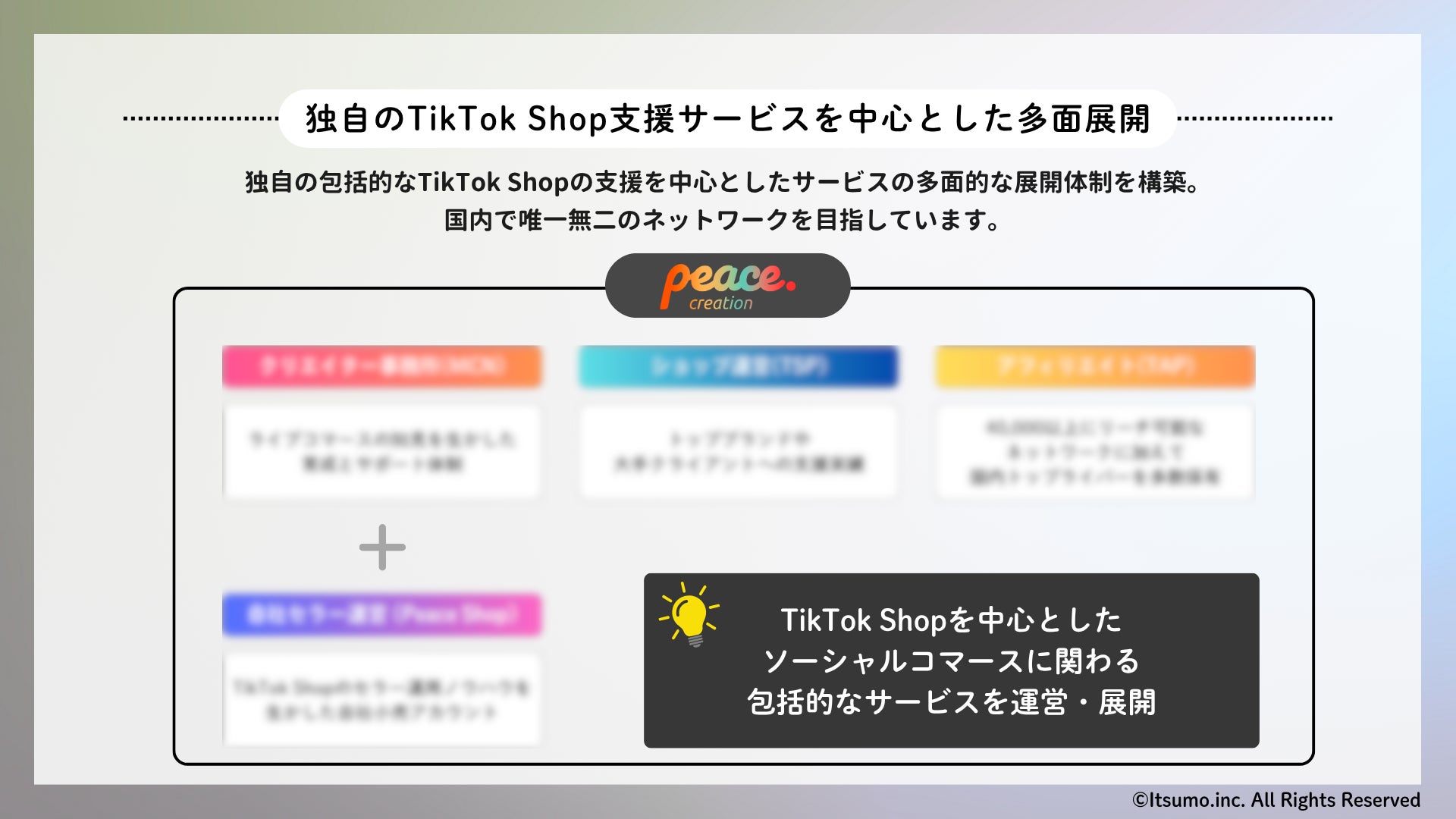 独自の包括的なTikTok Shopの支援を中心としたサービスの多面的な展開体制を構築しています。国内で唯一無二のネットワークを目指しています。