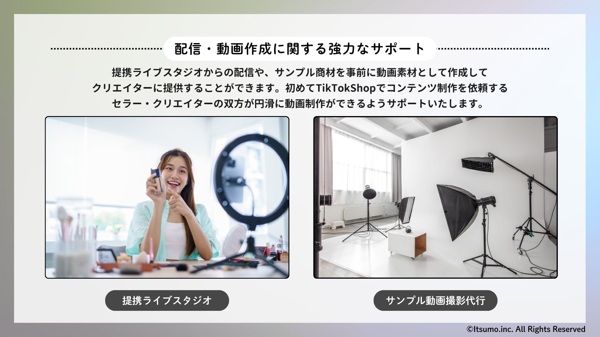 提携ライブスタジオからの配信や、サンプル商材を事前に動画素材として作成してクリエイターに提供することができます。初めてTikTokShopでコンテンツ制作を依頼するセラー・クリエイターの双方が円滑に動画制作ができるようサポートいたします。