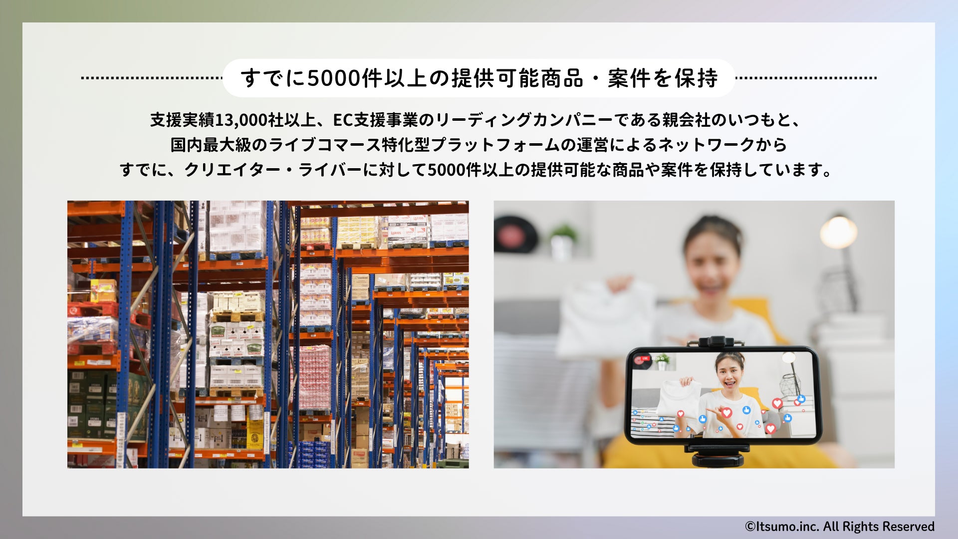 支援実績13,000社以上、EC支援事業のリーディングカンパニーである親会社のいつもと、日本最大級のライブコマース特化型プラットフォーム「Peace you LIVE」の運営によるネットワークからすでに、クリエイター・ライバーに対して5,000件以上の提供可能な商品や案件を保持しています。
