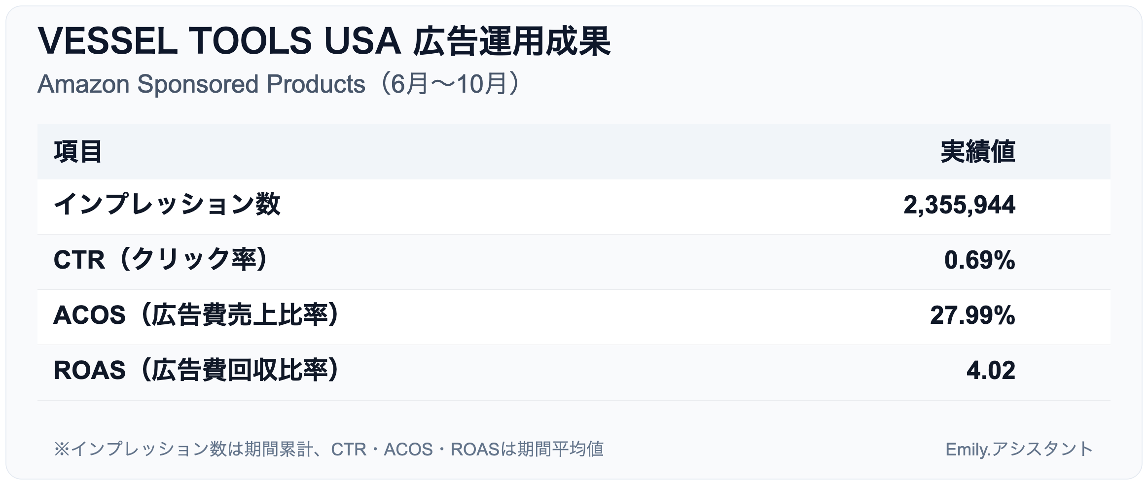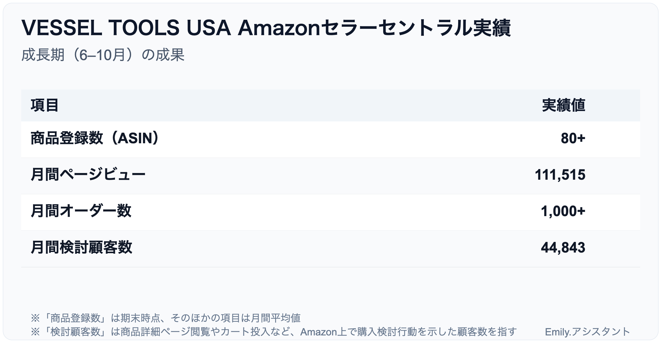 2025年2月のアカウント開設を機に、ゼロから事業を構築し、立ち上げ期(3〜4月)から成長期(6〜10月)にかけて、売上462%成長を達成しました。5月に実施したA+コンテンツの導入と商品ラインナップの拡充により、顧客エンゲージメントと販売実績が大幅に向上し、以下の顕著な成果を記録しました。