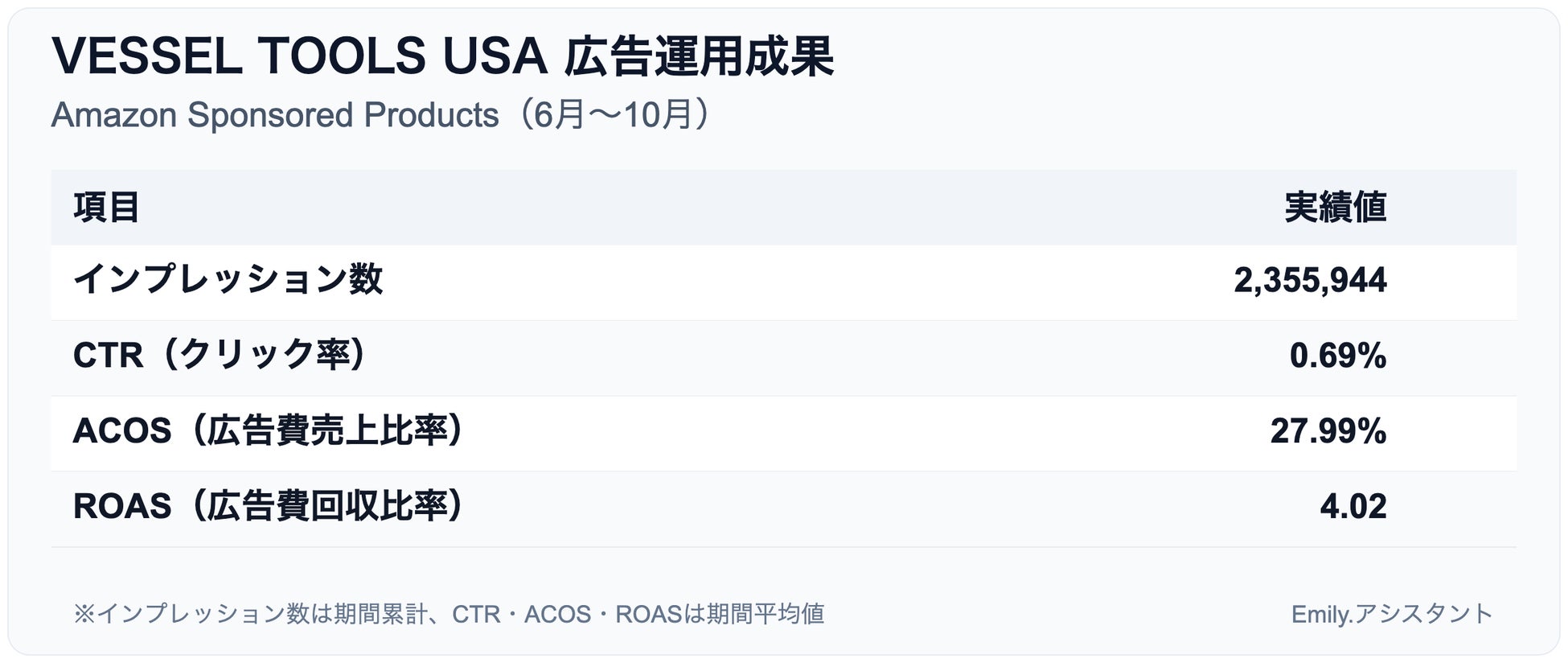 しかし、商品登録、広告運用、コンテンツ制作といった一連の業務を迅速に立ち上げる必要がある一方で、米国拠点にはAmazon運用の専門人材が不在という課題がありました。そこで同社は、立ち上げから継続運用まで、Amazon販売に必要な業務を一気通貫で推進すべく、Emily.アシスタントのサービスを導入しました。