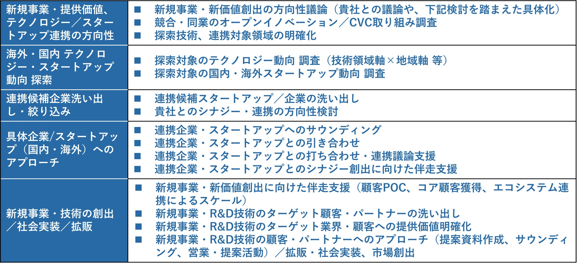 本サービスでは中堅企業(~大企業)の国内・海外でのスタートアップ連携、既存で生まれている新規事業の萌芽やR&D技術テーマの拡販・スケール・社会実装などの新価値・新規事業の創出・強化を月数十万円からスモールスタートを伴走します。