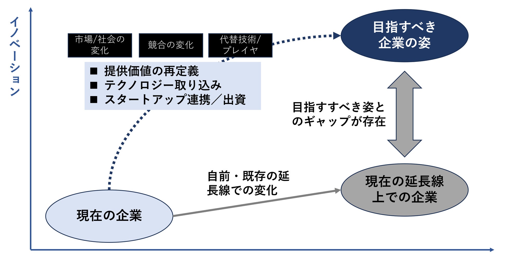 現在企業としては①市場・社会の変化、②競合の変化、③デジタル化等代替技術や新規プレイヤーの存在により、変化が求められている状況です。そうした中で自前・既存の延長線上での変化に限界があり(1)提供価値の再定義、(2)テクノロジー取り込み、(3)スタートアップ連携/出資 等が必須となっています。