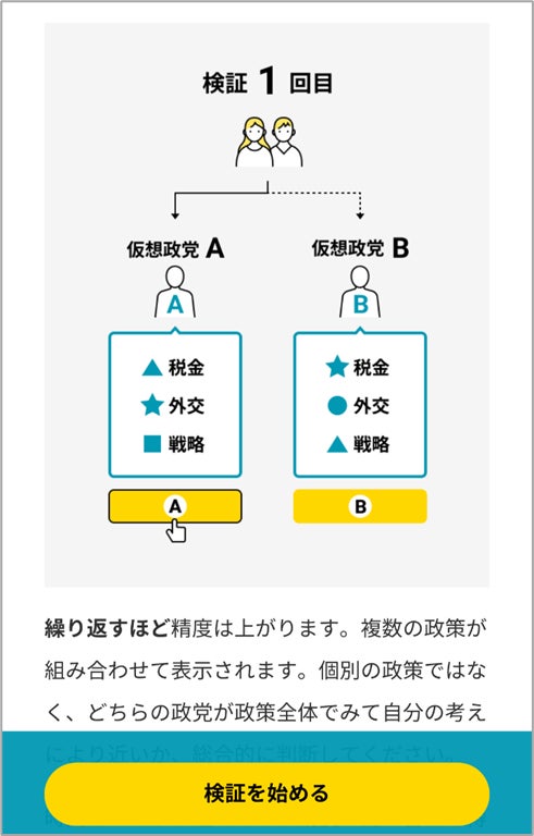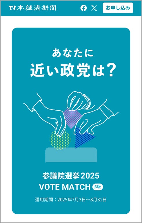 VETA株式会社(ヴィータ。本社:東京都新宿区、代表取締役CEO原健人、以下 VETA社)は、日本経済新聞社が本日公開した、7月20日投開票となる参議院議員選挙に向けて実施するボートマッチ「参議院選挙2025 VOTE MATCH あなたに近い政党は?」に分析・計算アルゴリズムを提供いたしました。日本経済新聞社が実施する「参議院選挙2025 VOTE MATCH あなたに近い政党は?」は利用者の考えに近い政党と利用者が重視する政策をスコア化して提示するもので、分析・計算アルゴリズムはVETA社に所属する山本鉄平(VETA社 CSO、早稲田大学政治経済学術院教授)と日野愛郎(VETA社CKO、早稲田大学政治経済学術院教授)が開発した、コンジョイント分析を独自に発展させたValue Elicitation法を適用したアルゴリズムを用いています。今回ボートマッチはVETA社が2025年4月設立されて以来、Value Elicitation法を用いたアルゴリズムを提供した初めての事例です。VETA社はこれまでにない定量的指標を有権者に提供することにより、選挙に関連する情報環境のさらなる改善に向けて、今後もボートマッチの分野をアルゴリズムの提供を目指す分野の一つとしています。