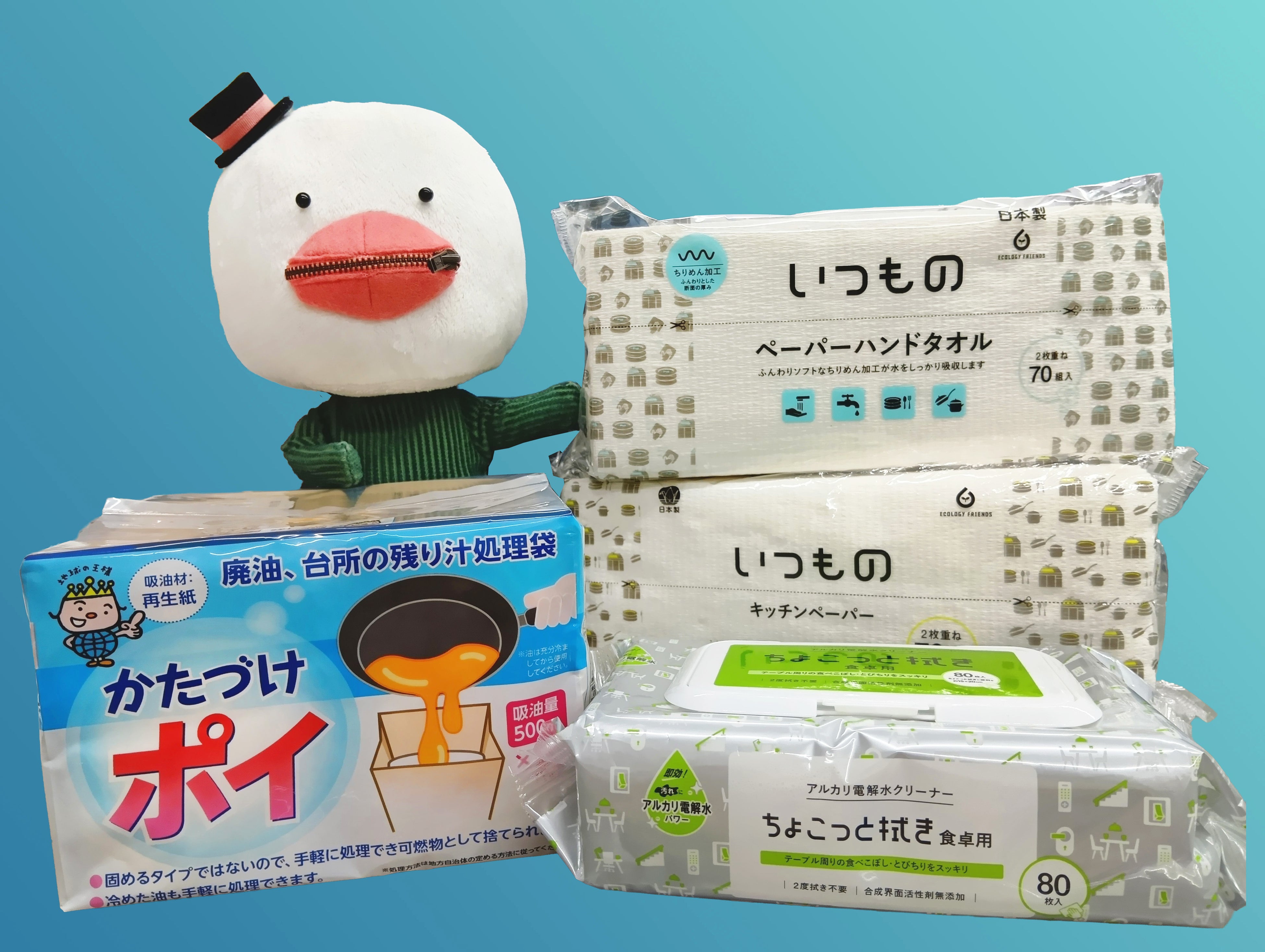 服部製紙では長年、人と地球の健康に配慮し、合成界面活性剤や防腐・防カビ剤などを極力使用しないお掃除シートや、油汚れが海に流れ出るのを防止するためのふき取りや吸い取りができる製品づくりを進めてきました。