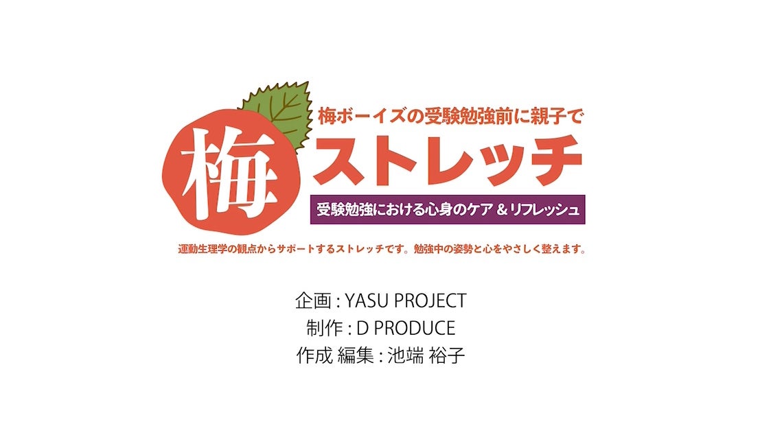 梅ボーイズが提案する「梅ストレッチ」は、「集中力が続かない」「ストレスが溜まっている」「受験当日までの体調が心配」といった受験生の悩みを解消し、限られた時間を最大限に有効活用するためのサポートツールです。多数のスポーツ・文化イベントを手がけるYASU PROJECT(東京都中央区、代表者:井上康治)が企画し、大阪府を中心にダンス教室、健康・体力づくり運動教室の講師として活躍する池端裕子さんの監修で制作しました。