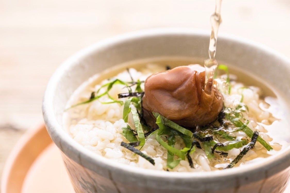 一方、よく噛まずに飲み込んでしまうと胃腸に負担がかかるという心配も。そこでお茶漬けに梅をプラスすると、すっぱさで分泌される唾液の酵素のはたらきで消化や整腸を助けます。