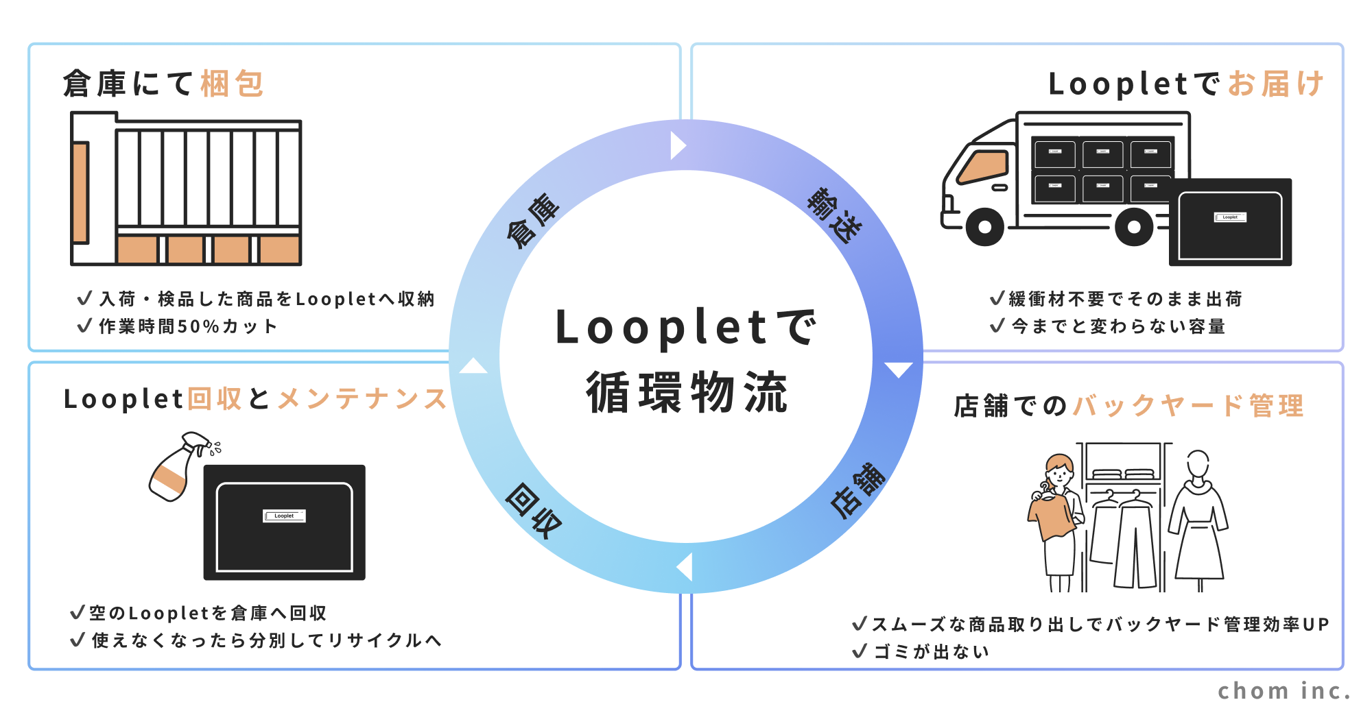 倉庫で商品をLoopletに収納し出荷した後、店舗ではそのままバックヤードや売場で活用され、使用後は再び回収されて倉庫へと戻ります。回収されたLoopletは、必要に応じてメンテナンスをへて再び流通に組み込まれます。