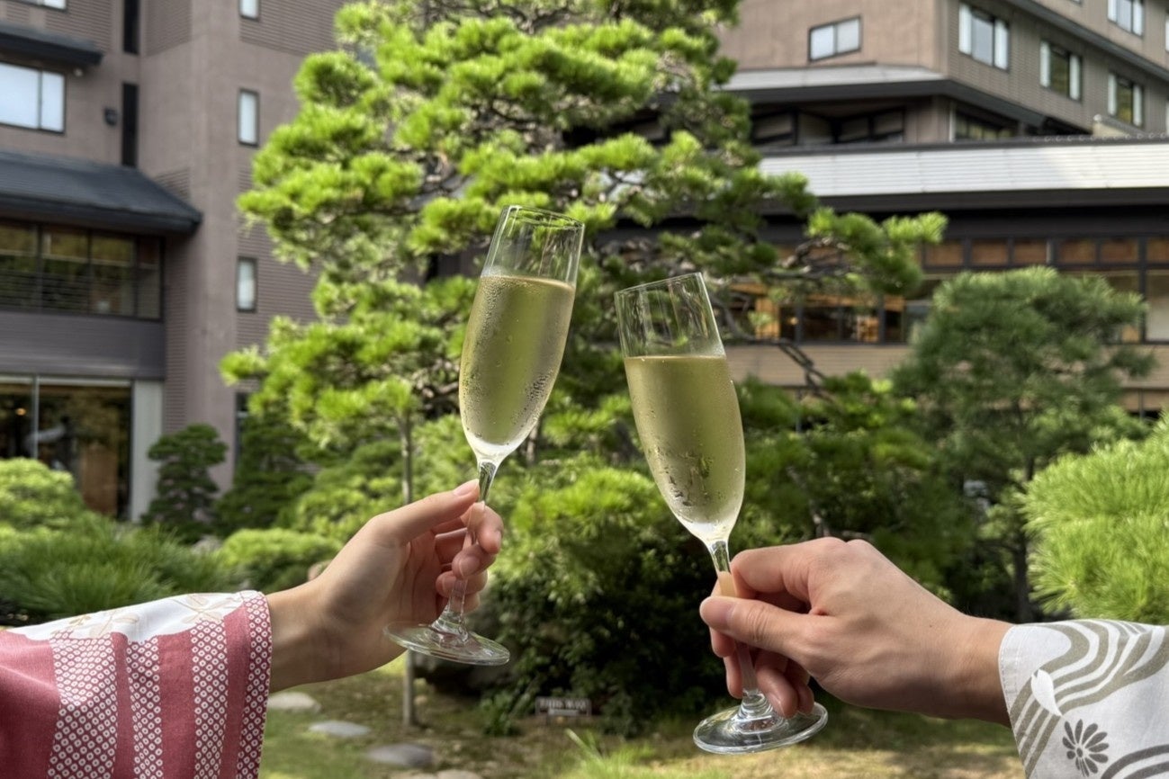 チェックインタイムには、日本庭園「曲水の庭」を臨む開放的な「ラウンジ土笛」で、スパークリングワインを無料でご提供いたします。