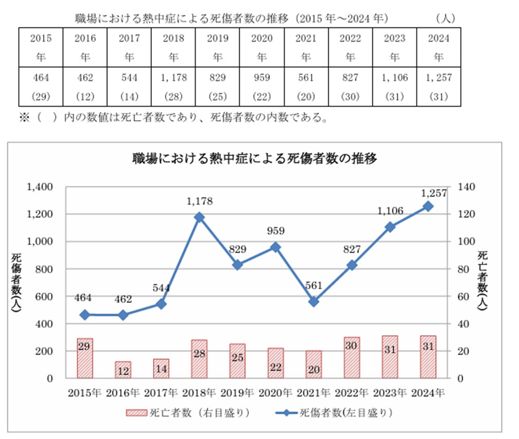 これに伴い、職場での熱中症による労働災害も増加し、2024年(令和6年)には休業4日以上の死傷災害が1,257件と、調査開始以来最多を記録しています。また、全体の約4割が建設業と製造業で発生しています。