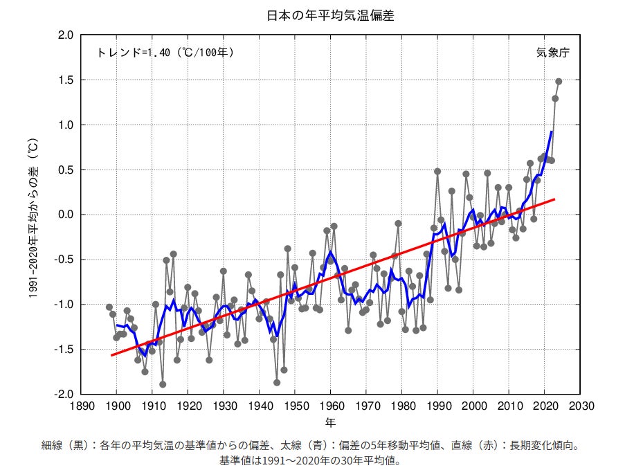 気象庁の発表によると、近年、日本の年平均気温偏差は上昇傾向にあり、特に2024年には