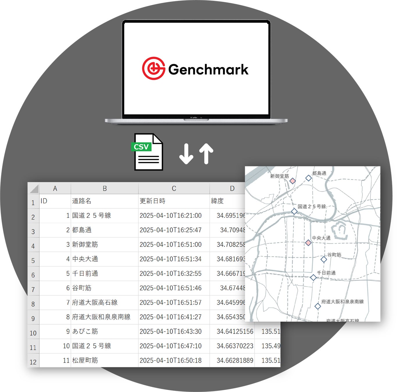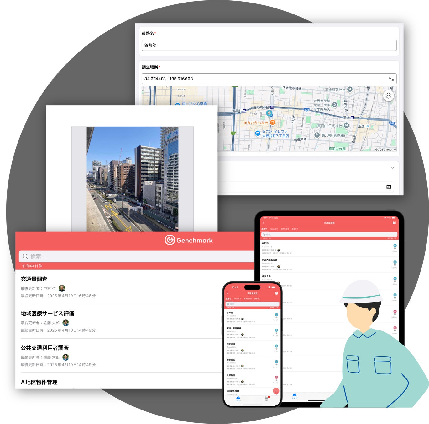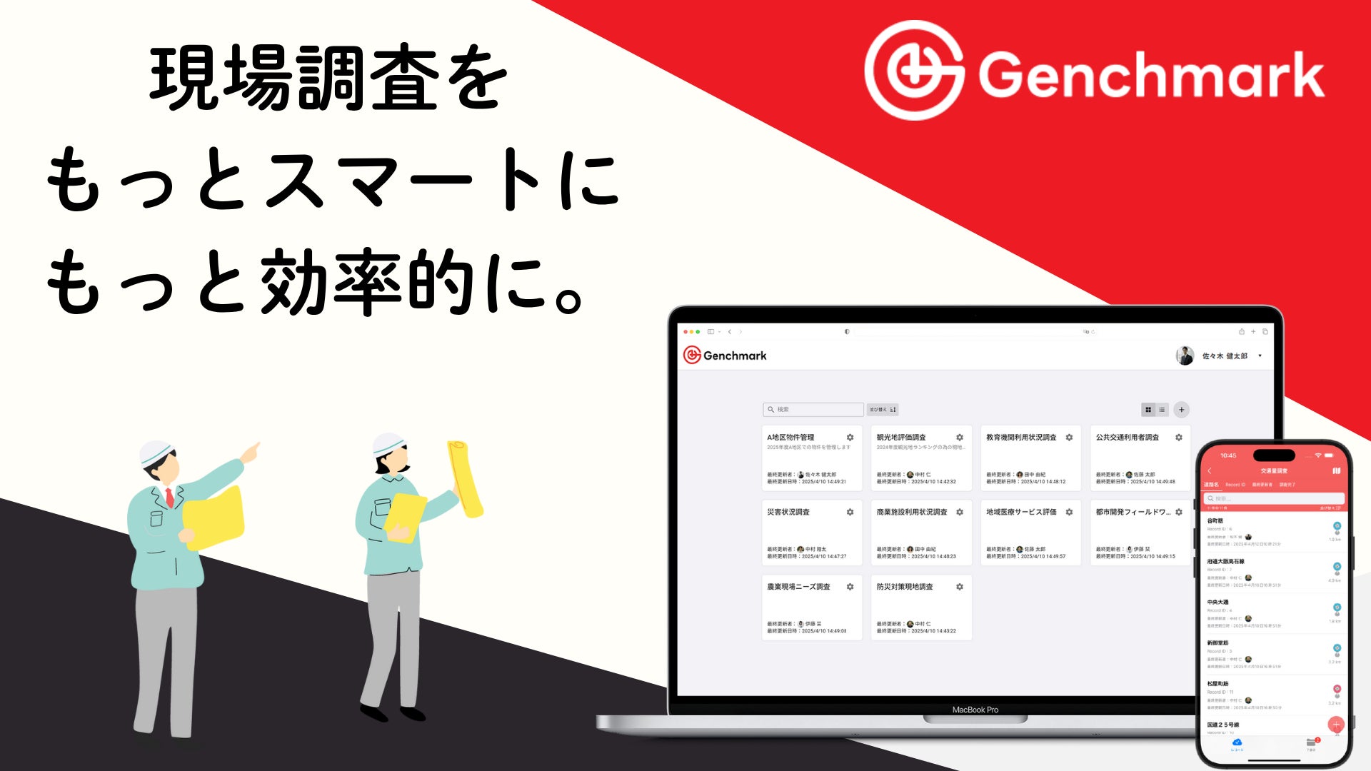 『Genchmark』は、Webアプリとモバイルアプリを組み合わせた現場調査専用のクラウド型アプリケーションです。位置情報を基に現地で収集したデータをクラウド上でリアルタイムに共有し、チーム全体の効率を最大化します。建設業界をはじめ、環境調査やインフラ点検など、幅広い業界での活用が期待されています。