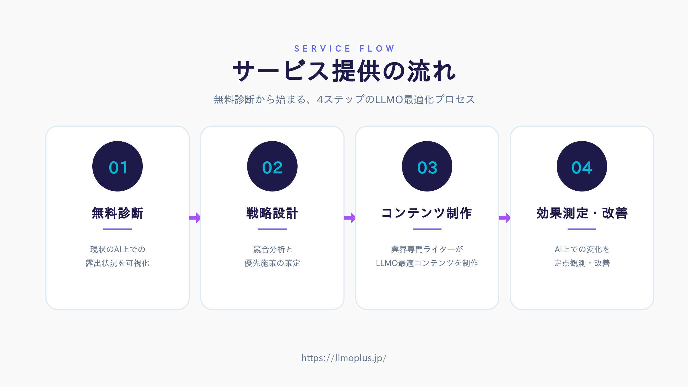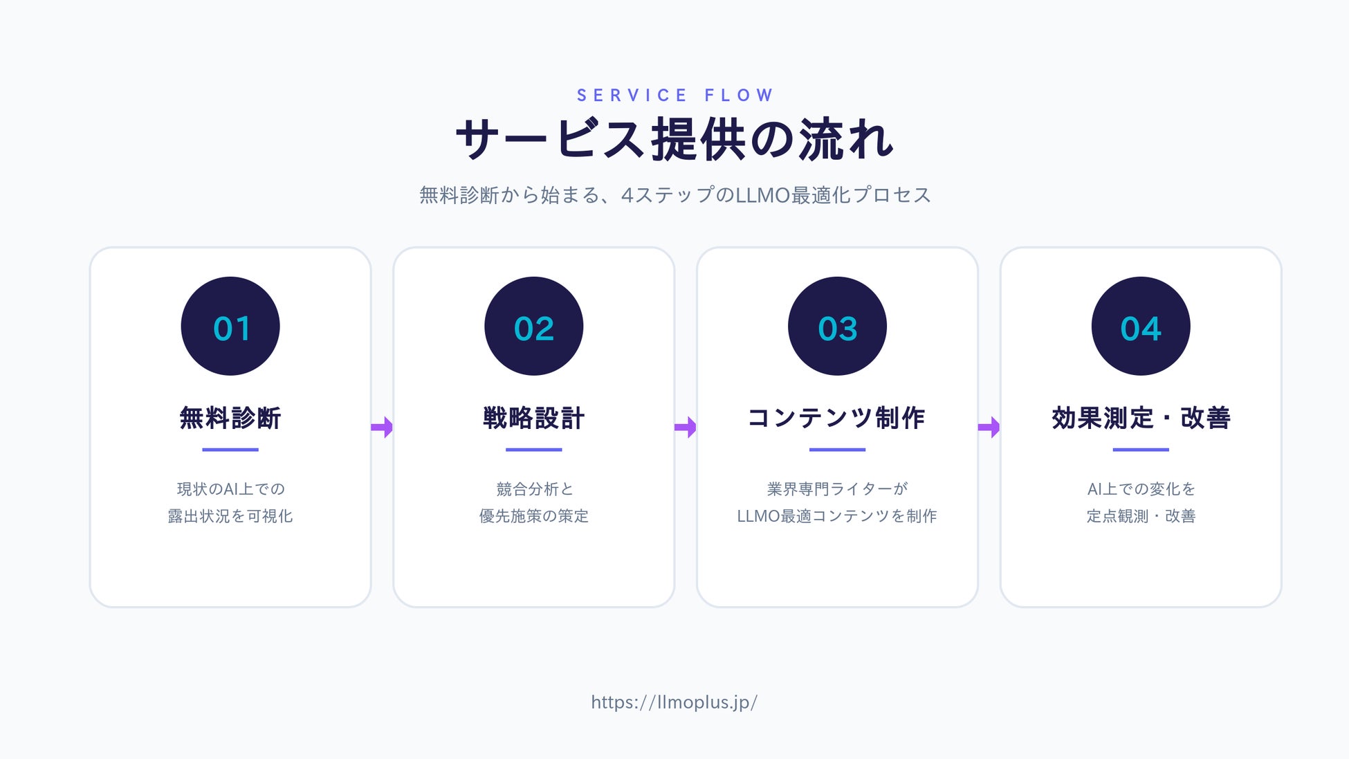 LLMO分析:自社サービス・ブランドが、ChatGPTをはじめとする主要LLMでどのように扱われているかを定量的に可視化 競合・引用構造の分析:AIが何を情報源として参照しているか、どの競合が優位かを明らかに LLMO最適化コンテンツの企画・制作:AIに「引用されやすい」構造・表現でコンテンツを設計 継続改善のレポーティング:施策実施後のAI上での露出変化をモニタリング