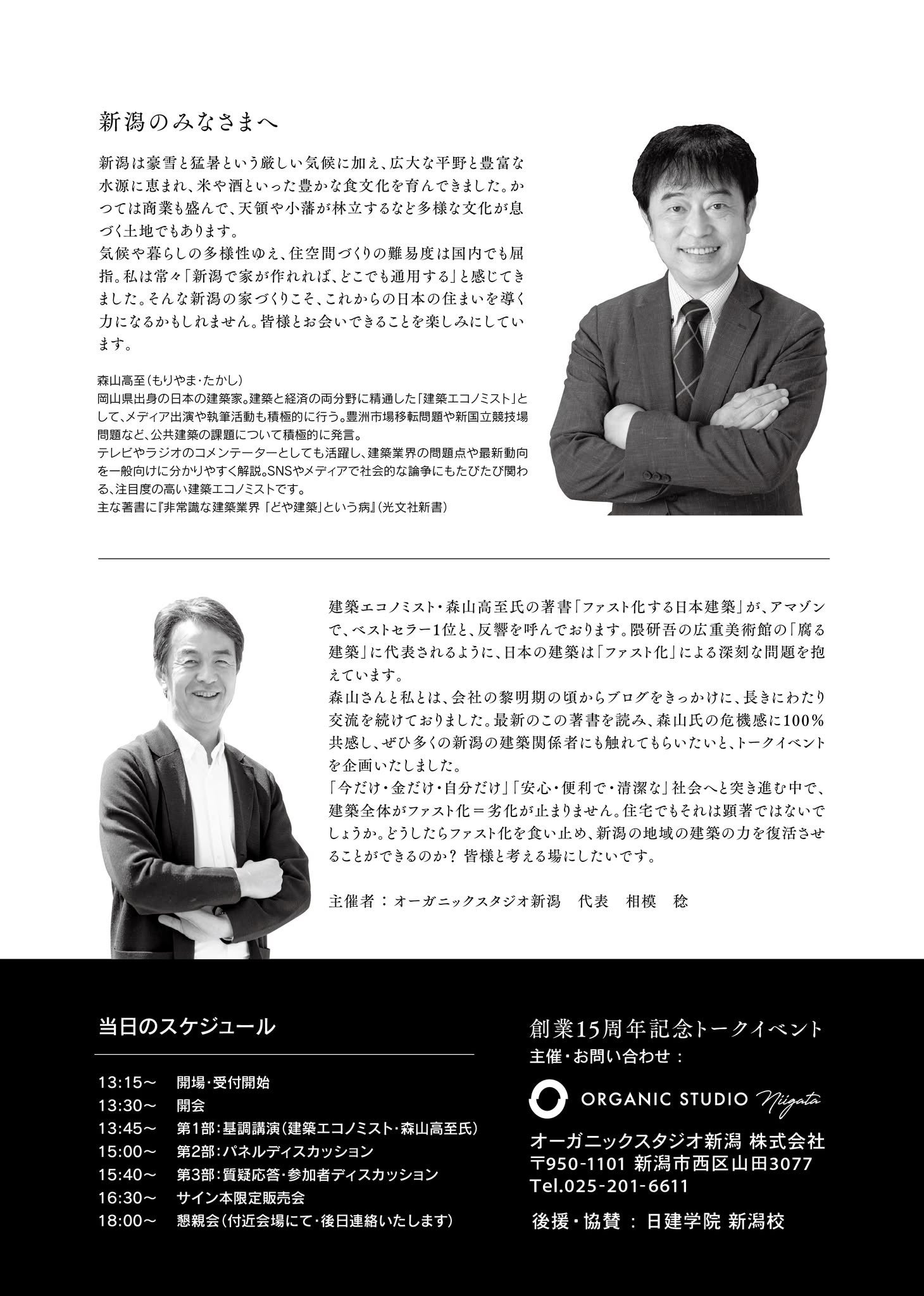 森山さんと私とは、会社の黎明期の頃からブログをきっかけに、長きにわたり交流を続けておりました。最新のこの著書を読み、森山氏の危機感に100%共感し、ぜひ多くの新潟の建築関係者にも触れてもらいたいと、トークイベントを企画いたしました。