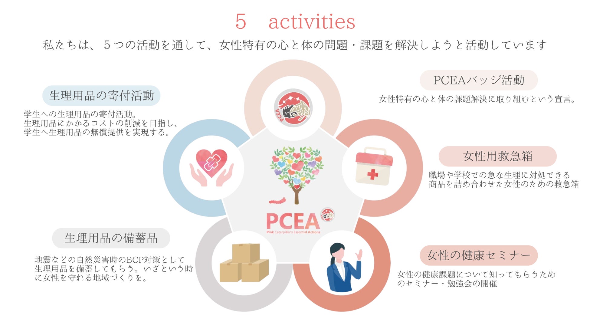 「“PCEA” は『Pink Caterpillar’s Essential Actions』の頭文字です。“ピンクのいもむし” がさなぎを経て蝶になり、自由に羽ばたくように——私たちも一歩ずつ行動を積み重ね、誰もが心と体のリズムに寄り添いながら、自分らしく生きられる社会を目指します。