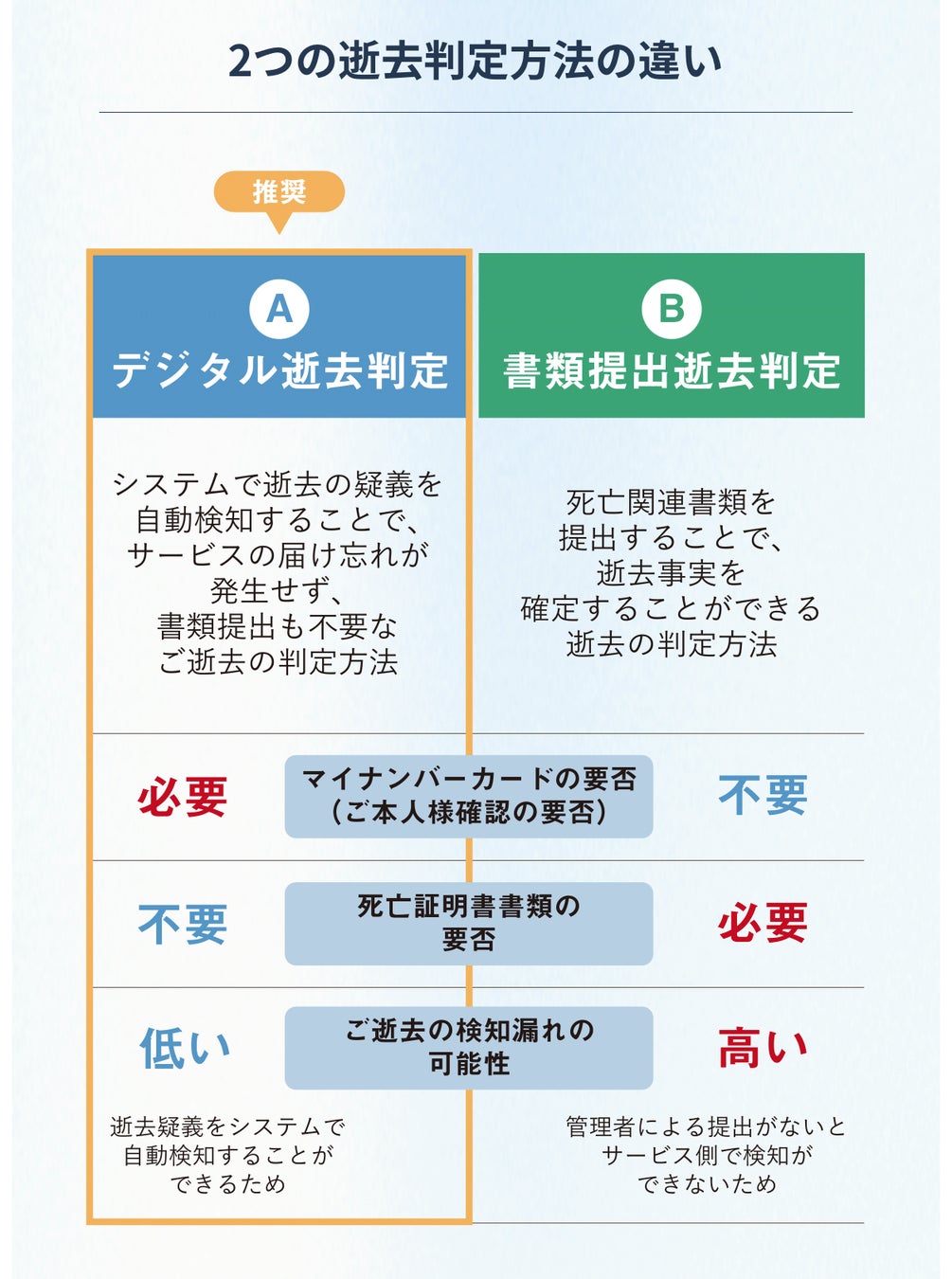 ご利用者様のニーズに合わせ、2種類の逝去判定方法を用意