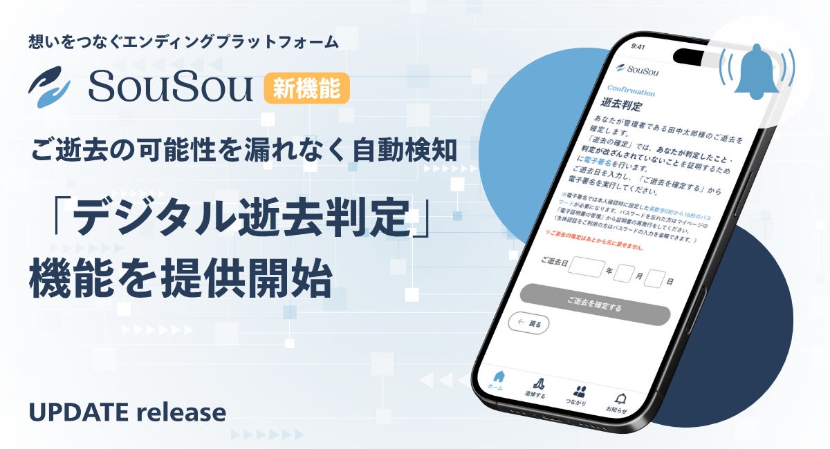 株式会社そうそう(本社:東京都荒川区、代表取締役:日下上総、以下「当社」)は、エンディングプラットフォーム「SouSou」において、2025年7月3日より新機能「デジタル逝去判定」を正式に提供開始いたします。