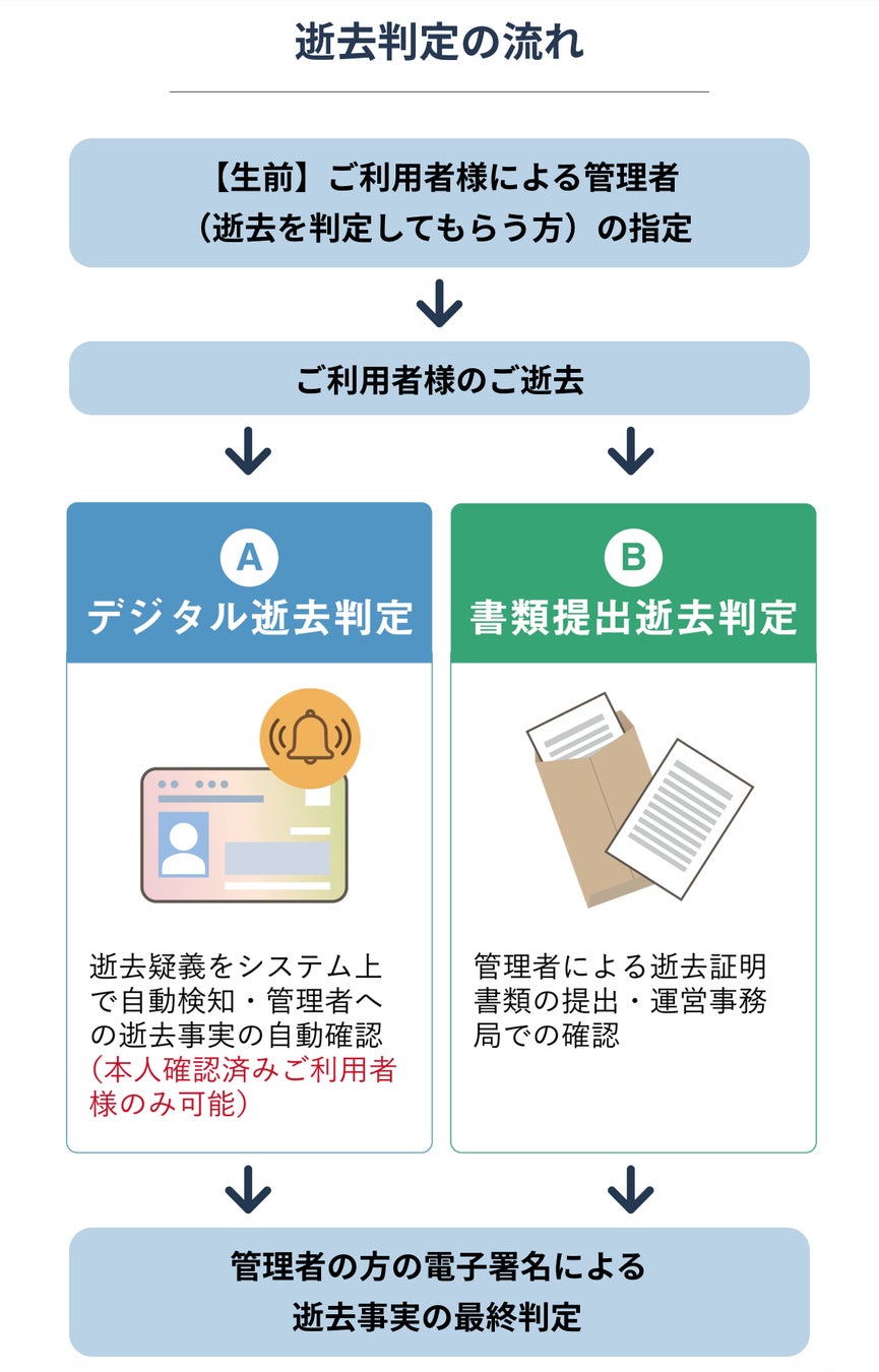 今回の新機能は、従来の逝去判定とは全く異なるアプローチで、サービス提供側にて漏れなくご逝去の可能性を検知し、生前に登録した「管理者」(ご逝去を判定してもらう方)に確認を促す世界初の仕組みとなります。