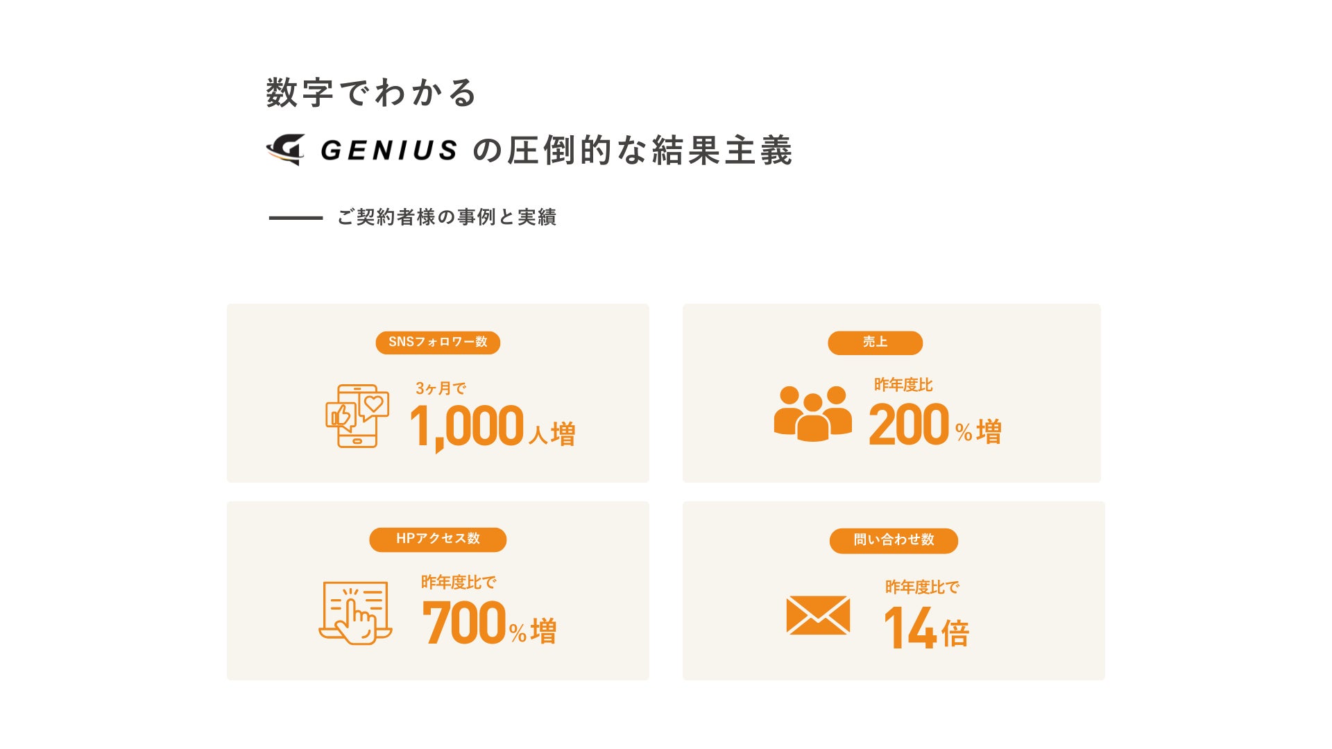 GENIUSは、「圧倒的結果主義」を掲げ、"単なる外注業者"ではなく「伴走者」として事業成果につながるマーケティング支援を提供してきました。