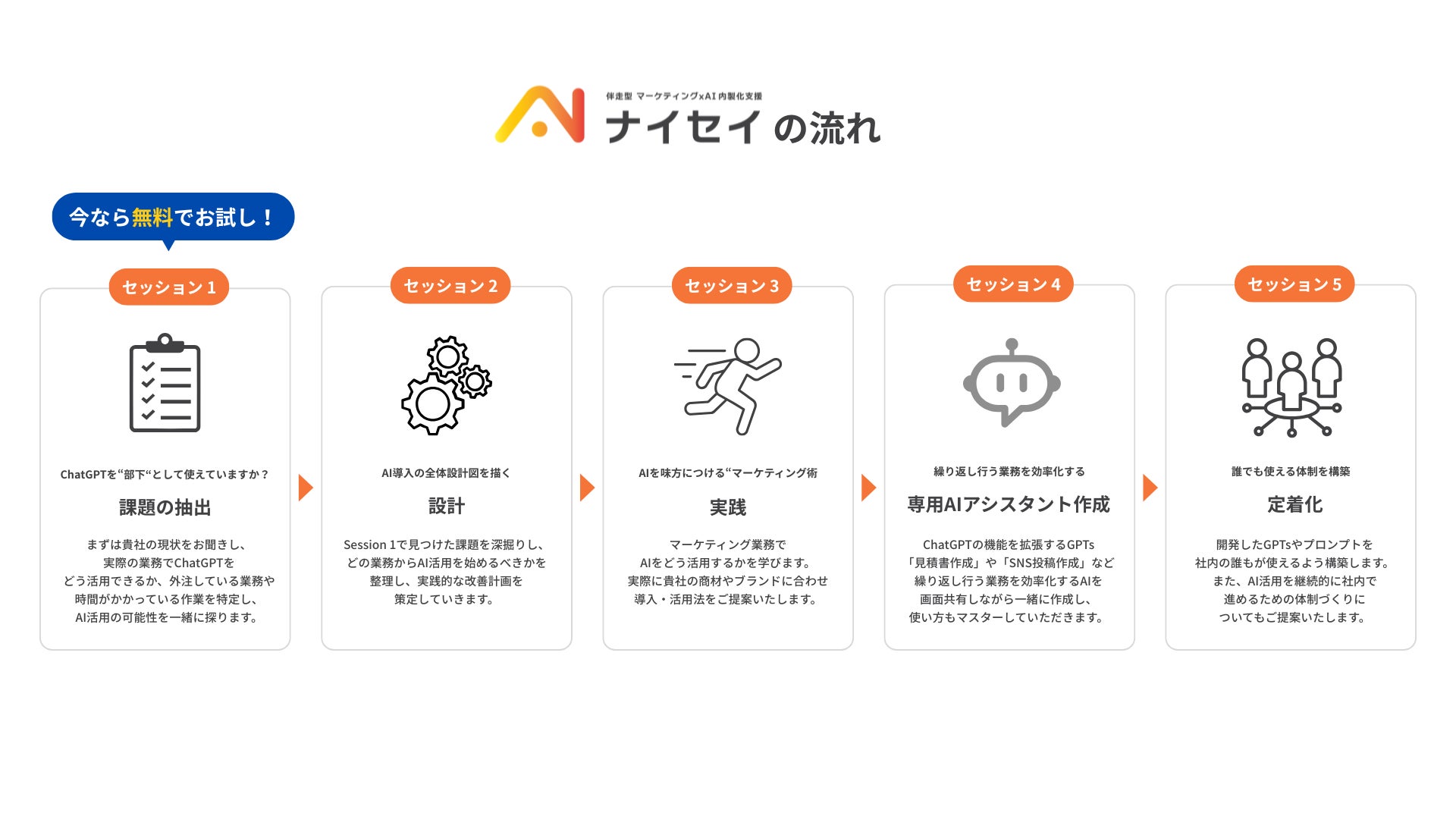 本サービスは、60分×5回のオンラインセッションを通じて、戦略設計からプロンプト作成、専用カスタマイズAI構築、運用体制の整備までを短期間で実現。これにより、外注に頼らず自社でマーケティングを回す“AI活用型の自走組織”への変革を支援します。詳しくはこちらのサービス紹介ページからご確認ください。