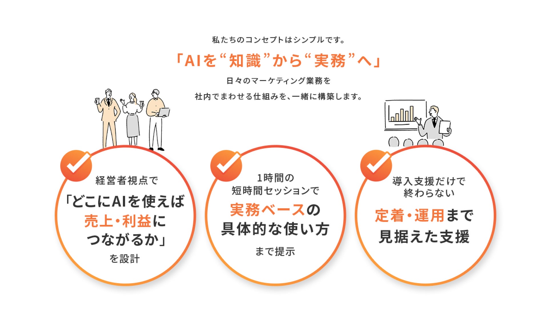 戦略策定、SNS投稿、メルマガ、ブログ記事、報告資料、広告コピー、顧客対応、PDCA設計、改善提案など、日々のマーケティング業務に直結するプロンプトとワークフローを体系化。 単なるツールの導入にとどまらず、成果を出すことにフォーカスしたAI活用を支援します。また、AI活用ノウハウを社内に定着させることで属人性を排除し、「マーケティングの自走化」体制の構築を実現します。