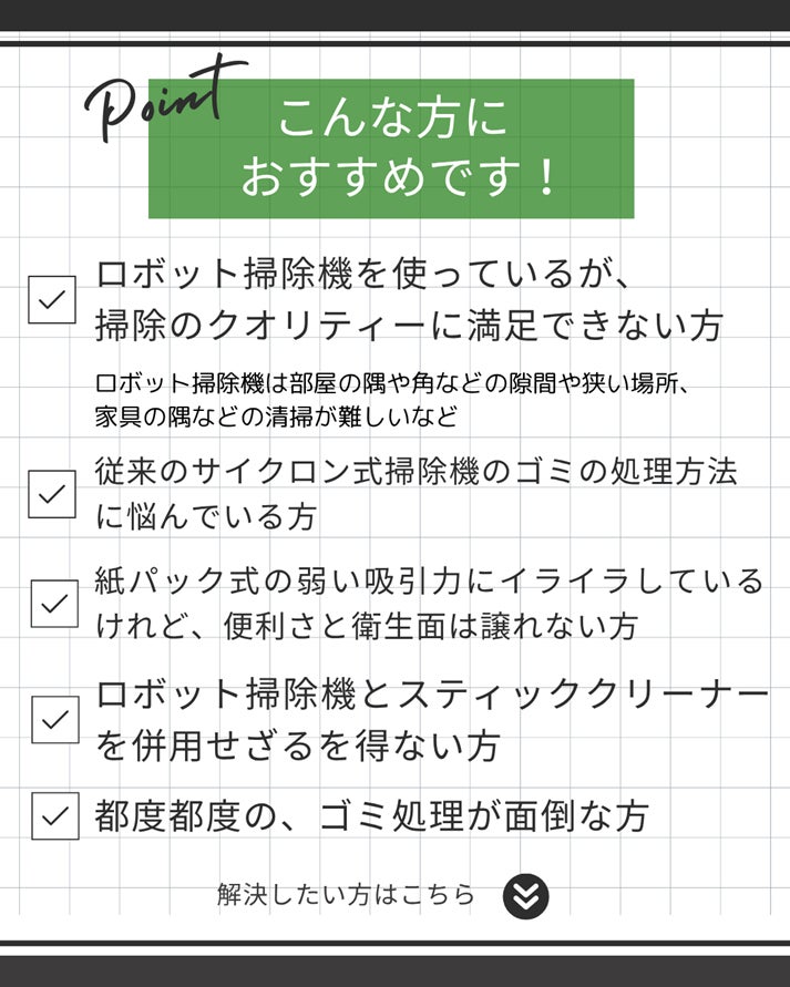 例えば、サイクロン式はダストカップに溜まったゴミを頻繁に捨てなければいけないですし、掃除機の充電や収納も面倒などのこともあります。そして、紙パック式は吸引力が物足りなかったり、容量が小さかったり…。