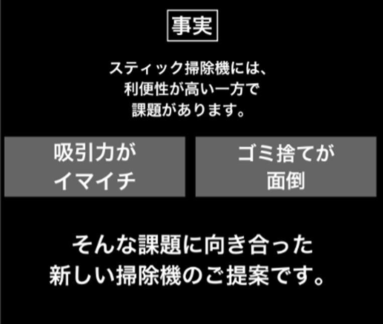 今までのスティック掃除機には、【吸引力が弱い。ゴミ捨てが手間という課題がありました。