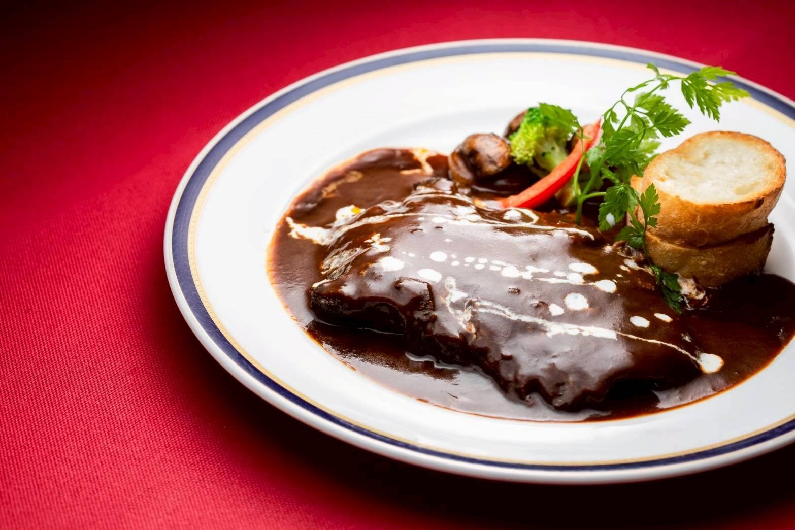 人気メニューの“24時間煮込んだ牛タンシチュー”。綺麗にサシの入った上質な牛タンを、丸2日間かけて丁寧に煮込み、箸で切れるほどの柔らかさに仕上げました。同じ鍋で煮込んだ特製デミグラスソースには、牛タンの脂と旨味が溶け込み、濃厚で奥深い味わいを実現しています。